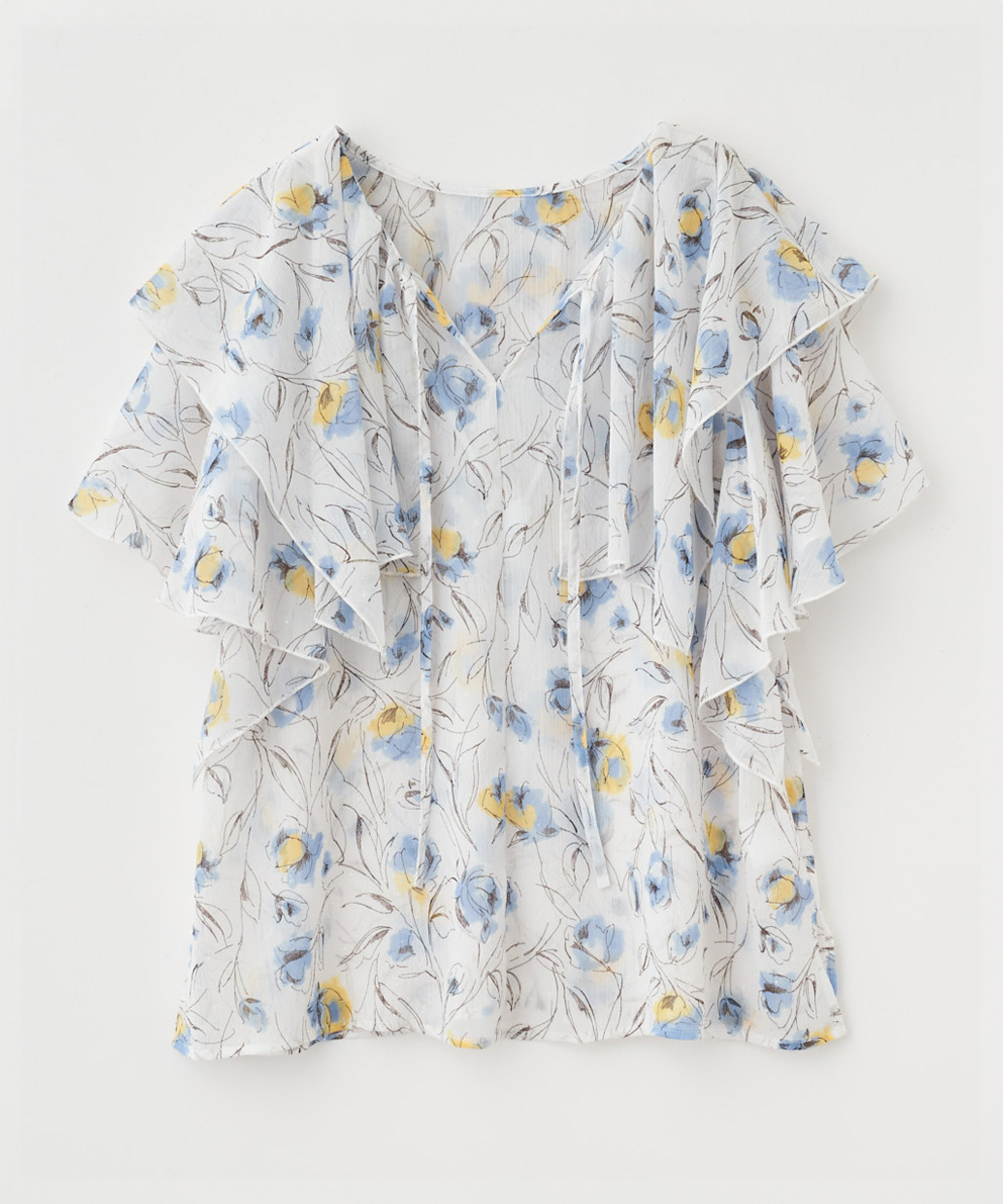 透け感のあるフラワープリントのブラウスをシンプルパンツと合わせてお仕事コーデに。