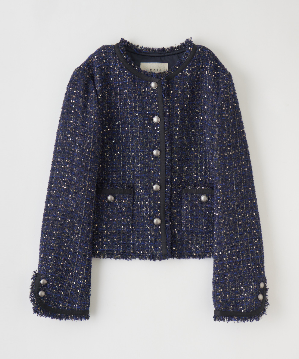 写真でも光に当たるとキラッとするスパンコール入りの生地は、ツイードですがそこまで厚手ではなく軽い着心地が◎