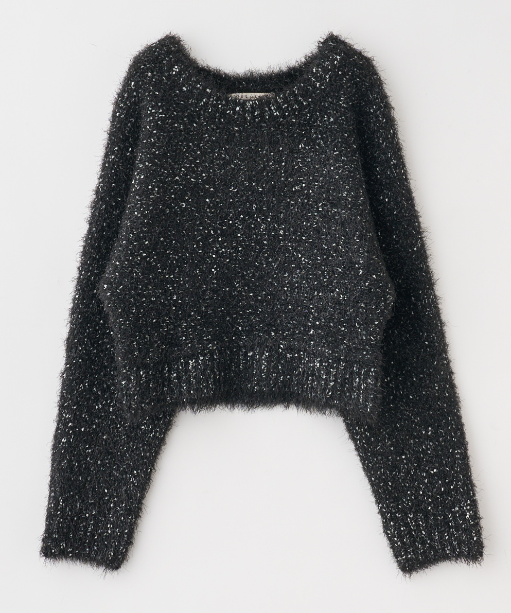 存在感のあるフェザーラメニットに、光沢感のあるパンツを合わせた綺麗めカジュアルコーデ。