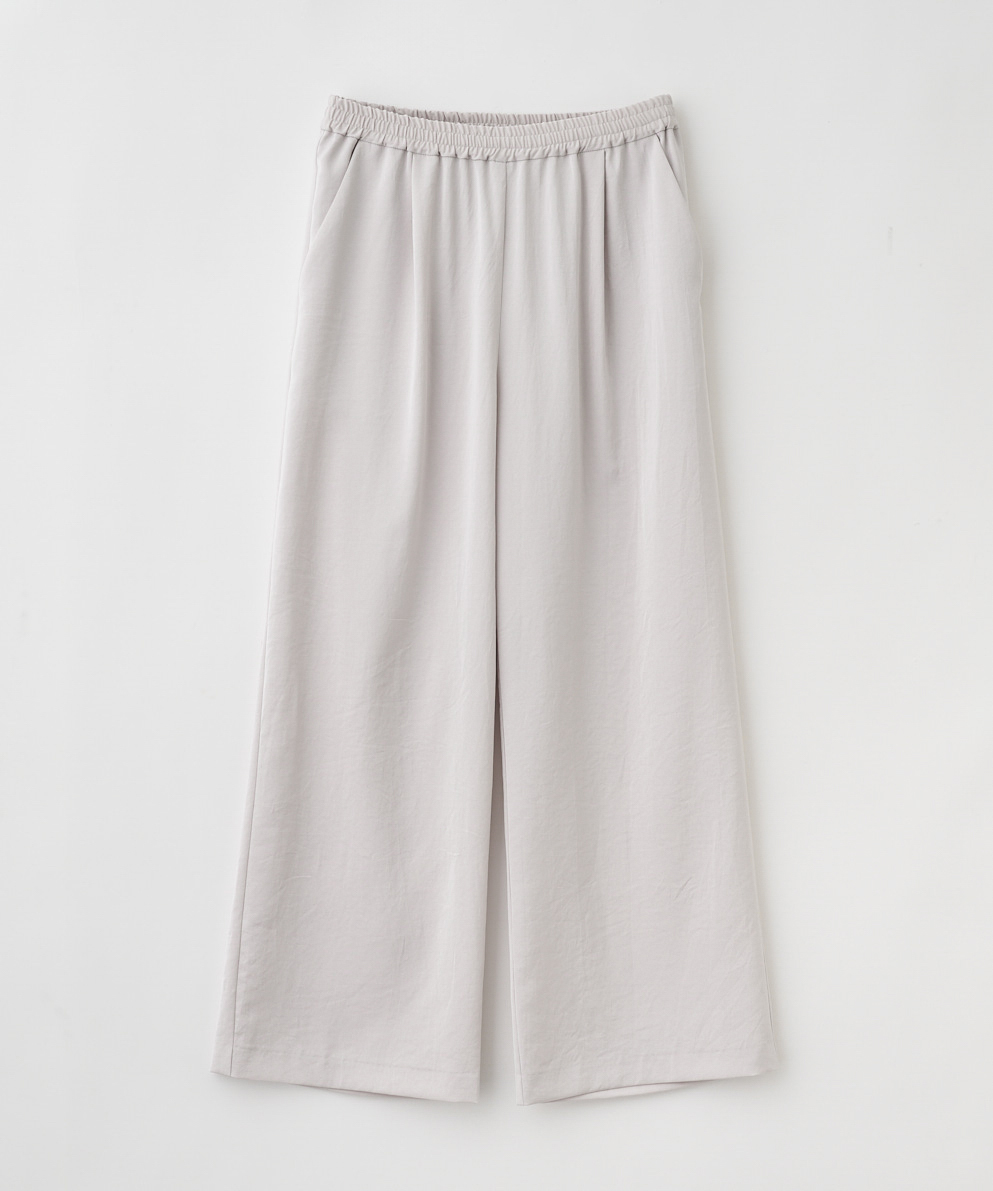 ワイドパンツでかっちり締めても良いですが、あえてラフなサテンパンツを合わせることで、オシャレ度がグッと上がります。
