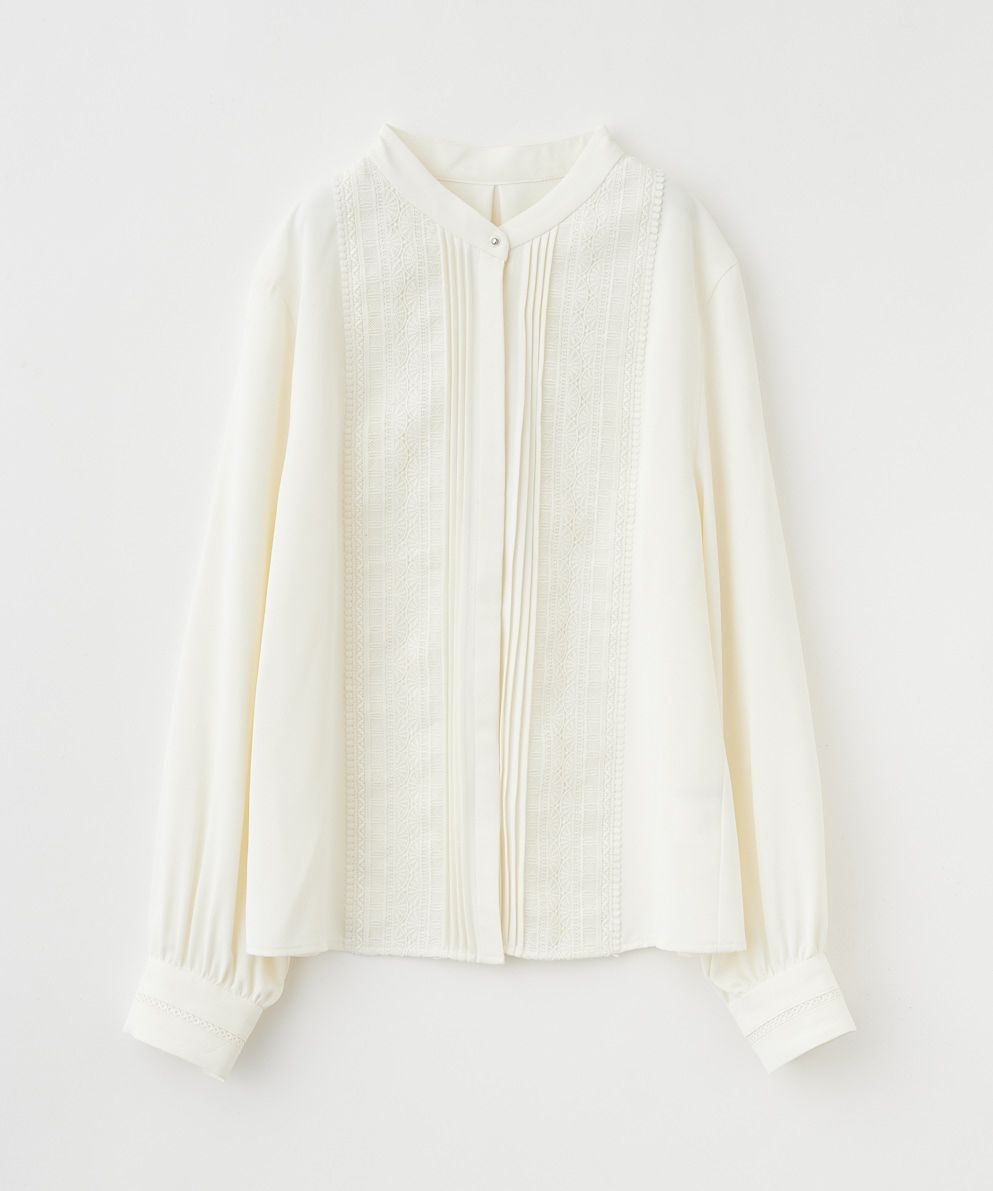 レースデザインのブラウスは中央にピンタックがあり甘くなりすぎずに着られます◎