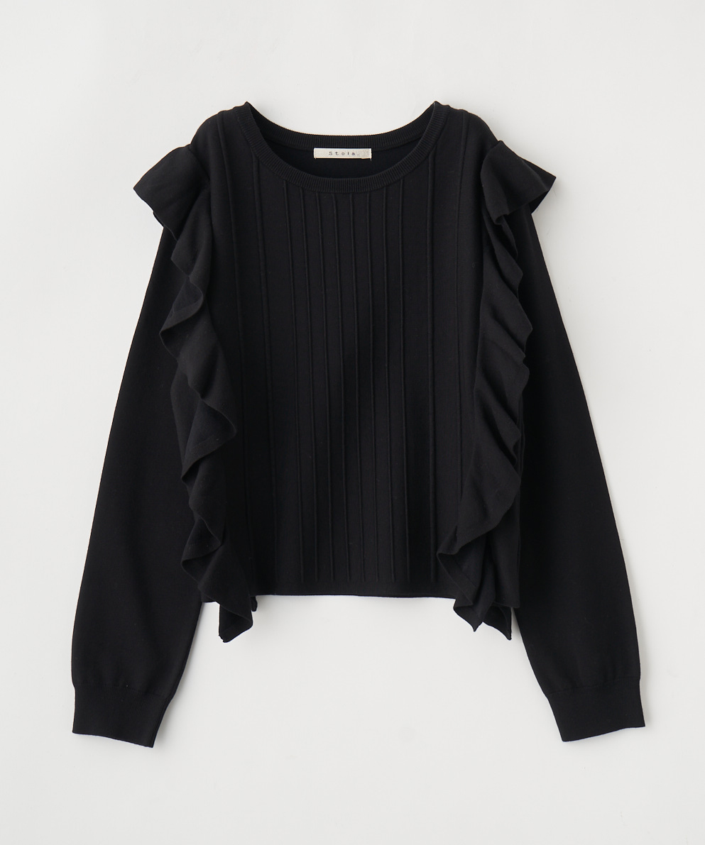 肩フリルが華やかなニットをキレイめパンツと合わせてフェミニンコーデに♡