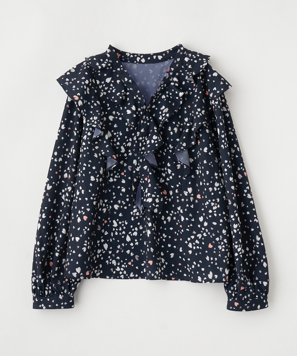ハート柄のブラウスはネイビーを選んでパンツと合わせると甘さ控えめに。