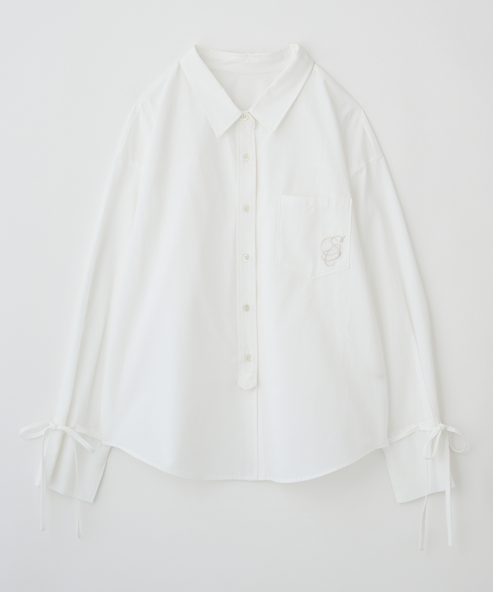 シンプルながらも、シャツの袖リボンやニットの裾のカールがさりげないアクセントに。