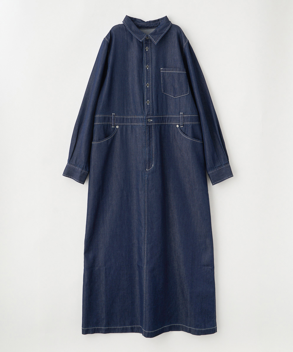 トレンドのレイヤードスタイルが叶えられるヘンリーネックニットに、デニムワンピを腰巻きにした大人カジュアルコーデ。