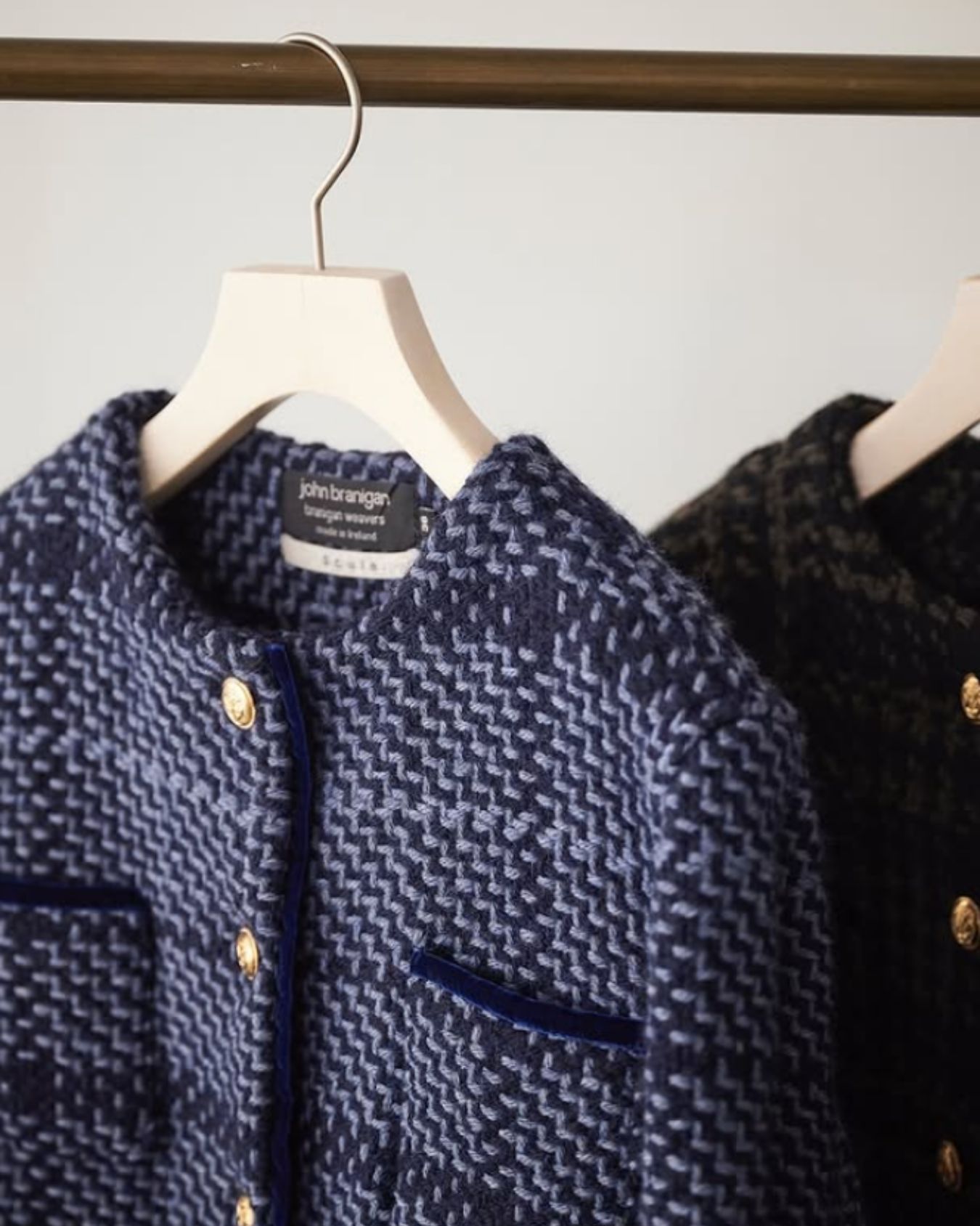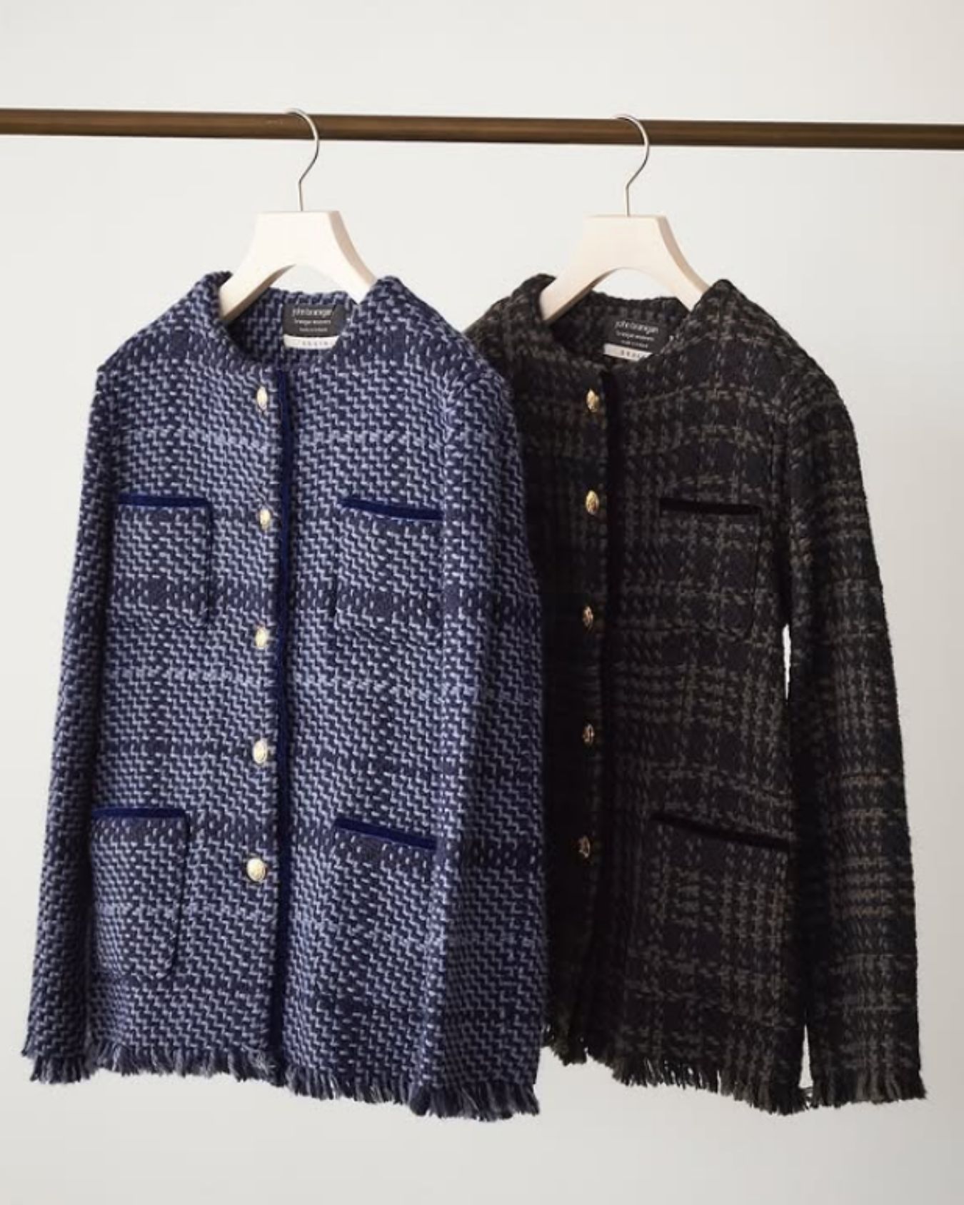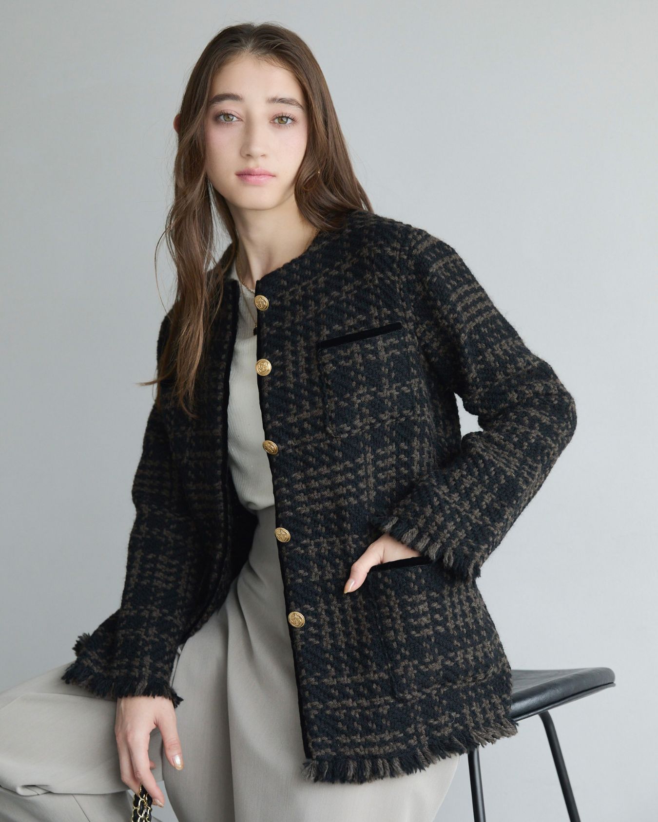 × john branigan ノーカラーチェックジャケット ウール混の糸で編まれた、温もりと軽さを叶えるツイードジャケット。 金ボタン、フロント&ポケットにさりげなく入れた配色、袖口&裾のフリンジがこだわりのデザインアクセント。 女性らしいすっきりとしたサイズに仕上げました。 ネイビーはStola.だけのオリジナルカラー。