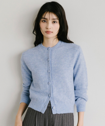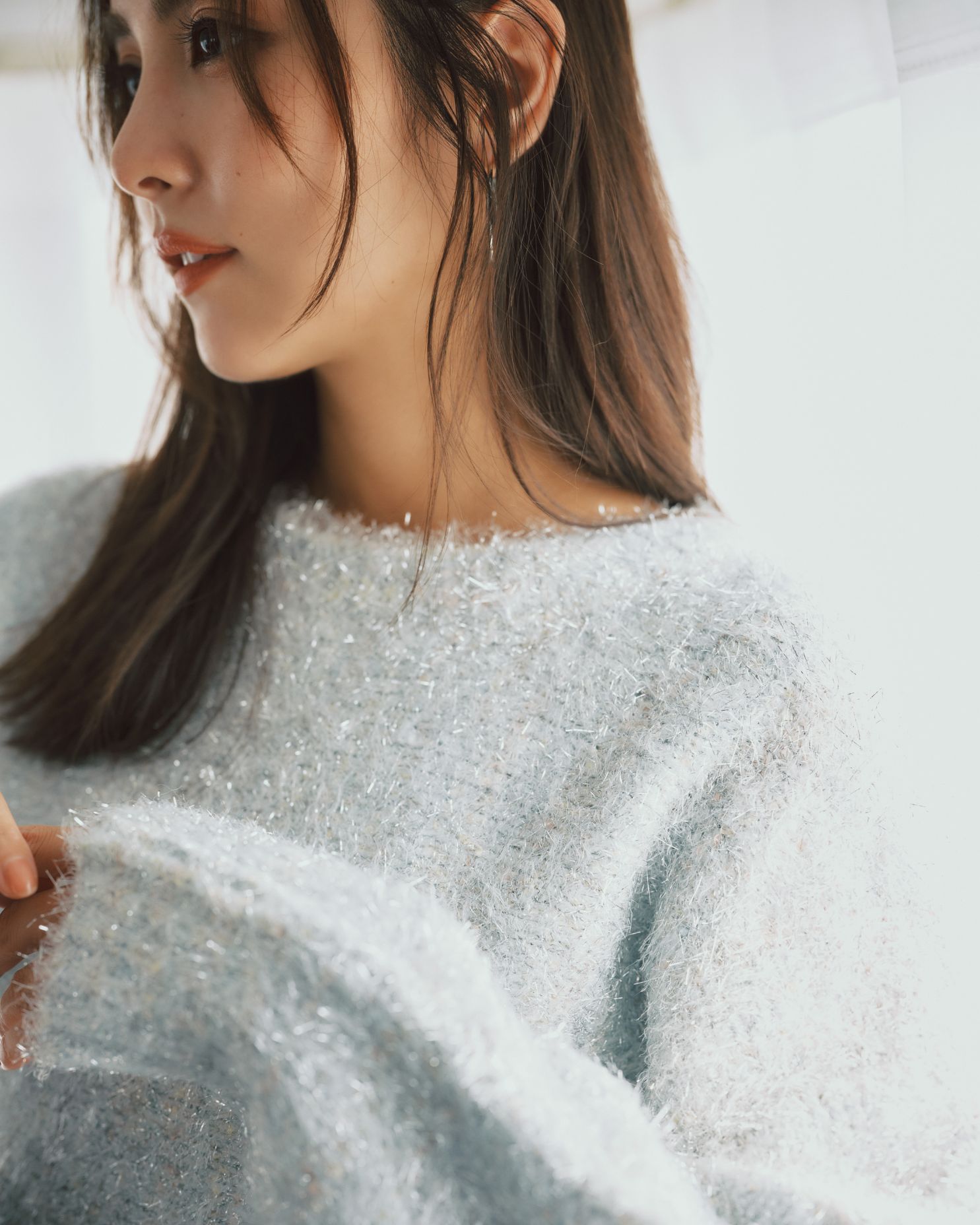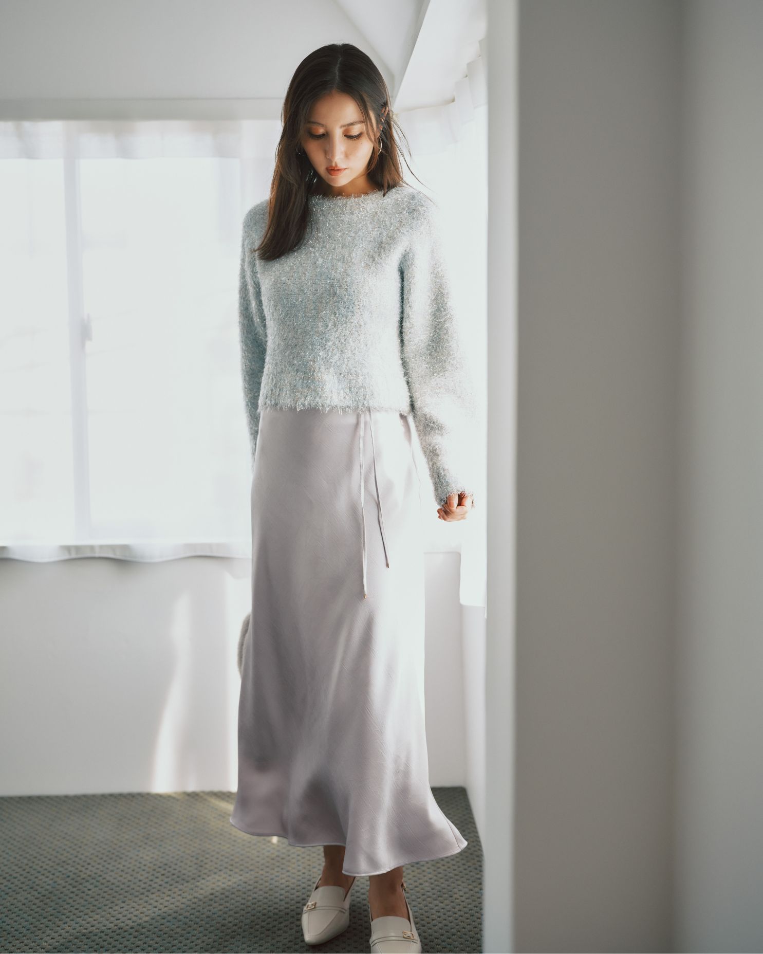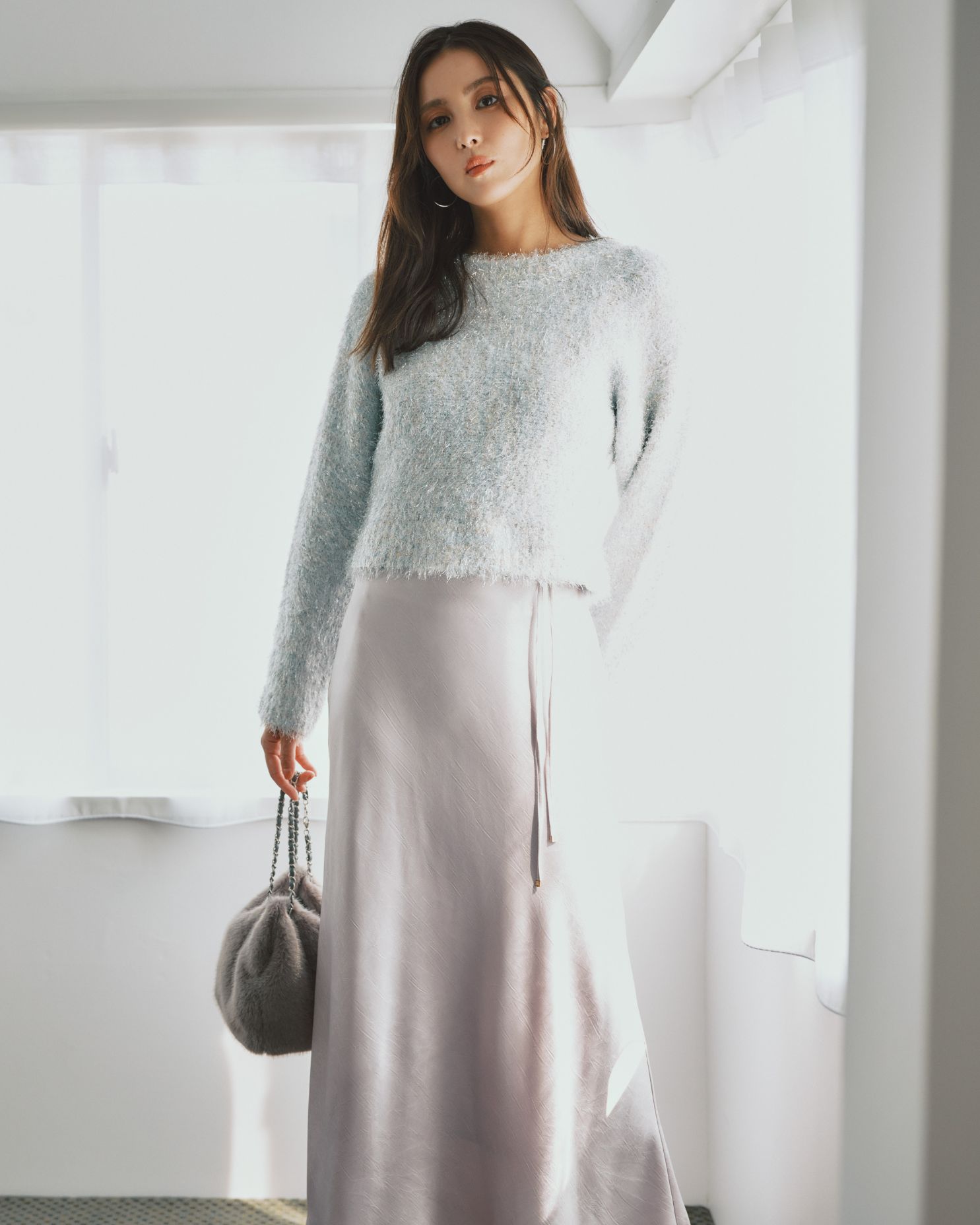 シルバーのベースに、何色もの淡いカラーをMIXさせた主役ニット。 ラベンダーのスカートで女性らしくまとめて。