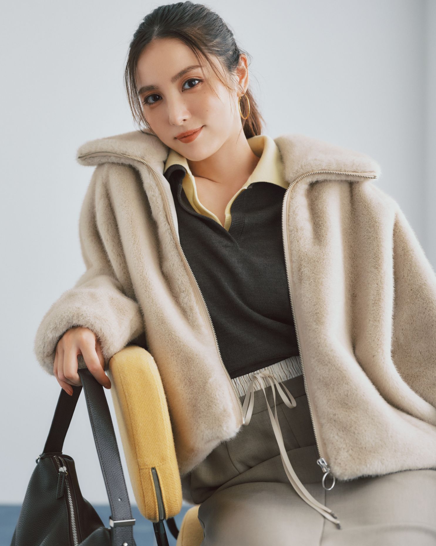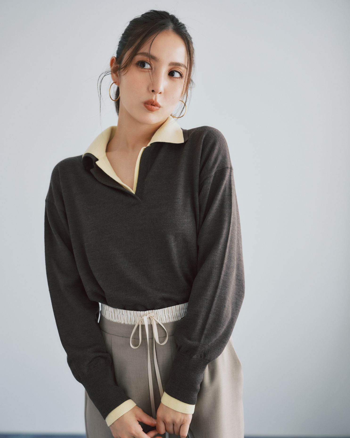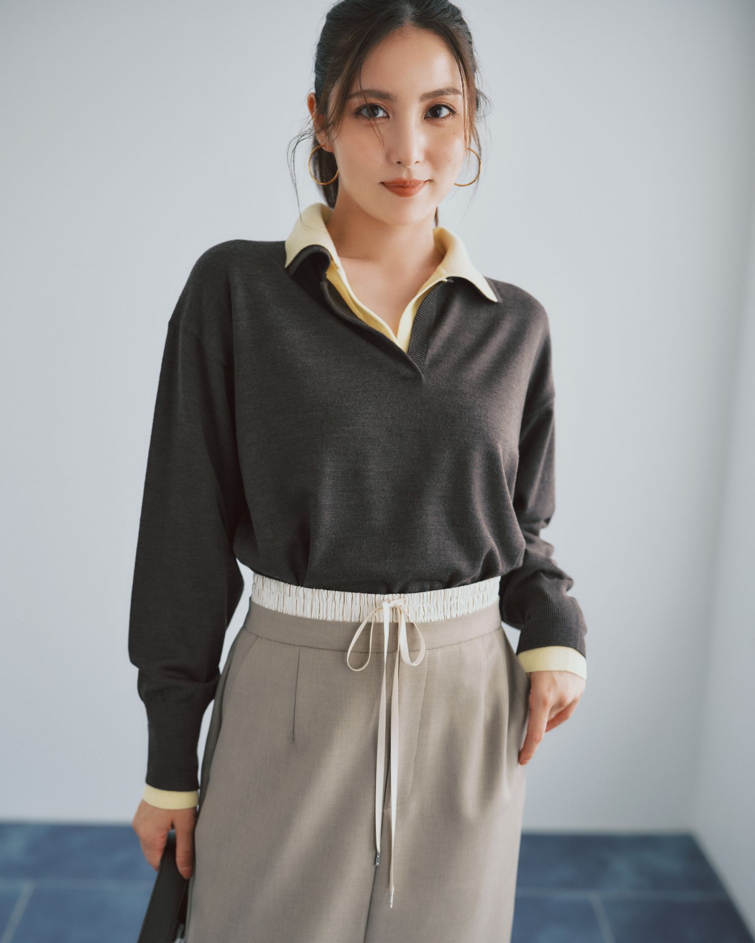 襟付きのニットは、今年持っておきたいトレンドアイテム。 色違いの2枚を重ねるテクニックは簡単なのに、洒落感が格段にアップ! スカートにもレイヤード風デザインを取り入れて、さらに今っぽく。 スポーティなムードには、ファーで女らしさを纏って都会的に着こなして。