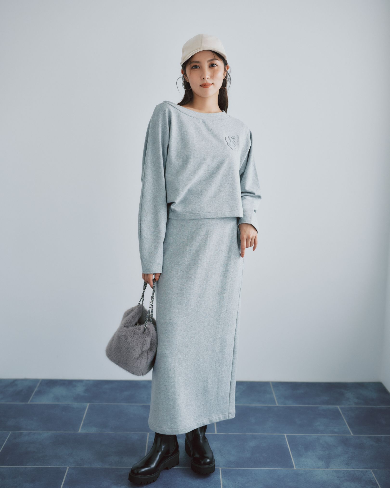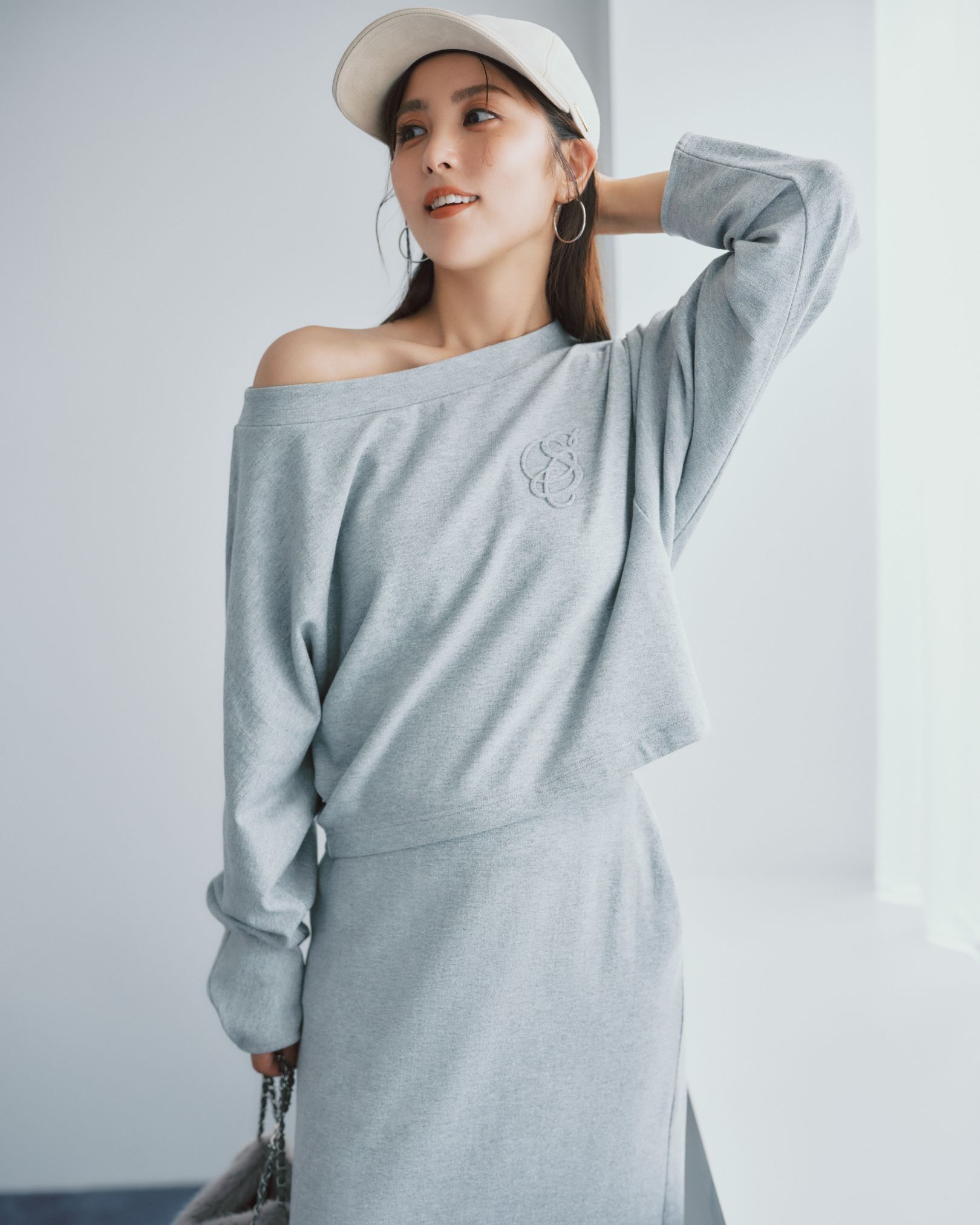 上品にきらめくラメとエンボスロゴが魅力の大人なスウェット 短丈のプルオーバーとスカートのバランスや、厚すぎず薄すぎない絶妙な生地感、衿ぐりとウエストの裏リブ加工など 細部までこだわりたっぷりなセットアップ。 ベーシックに着ても、ヘルシーにワンショルダーで着ても、単品使いでも◎ GRAY / BLACK 再入荷 MOCHA BROWN 予約販売スタート