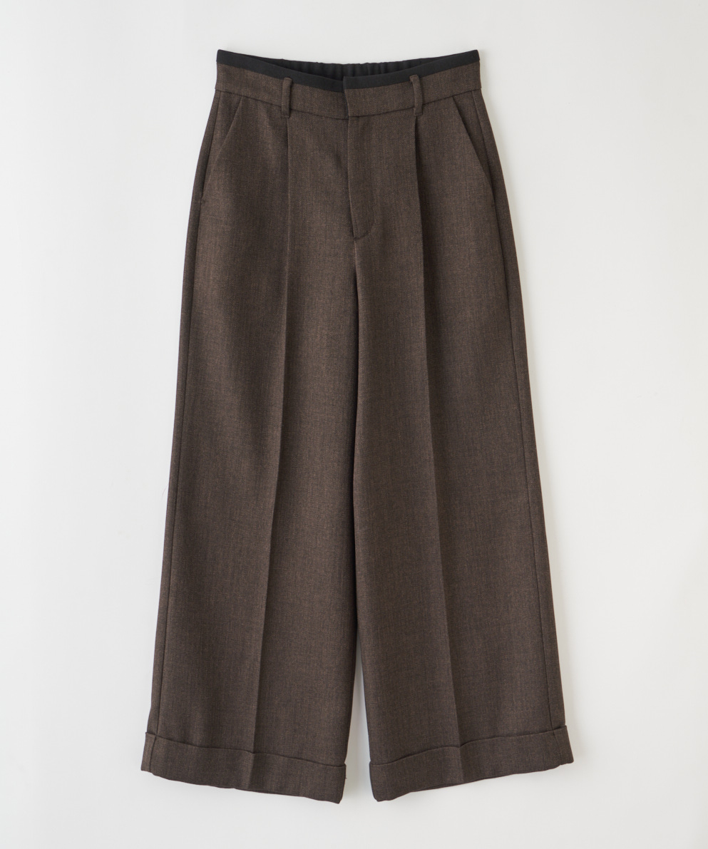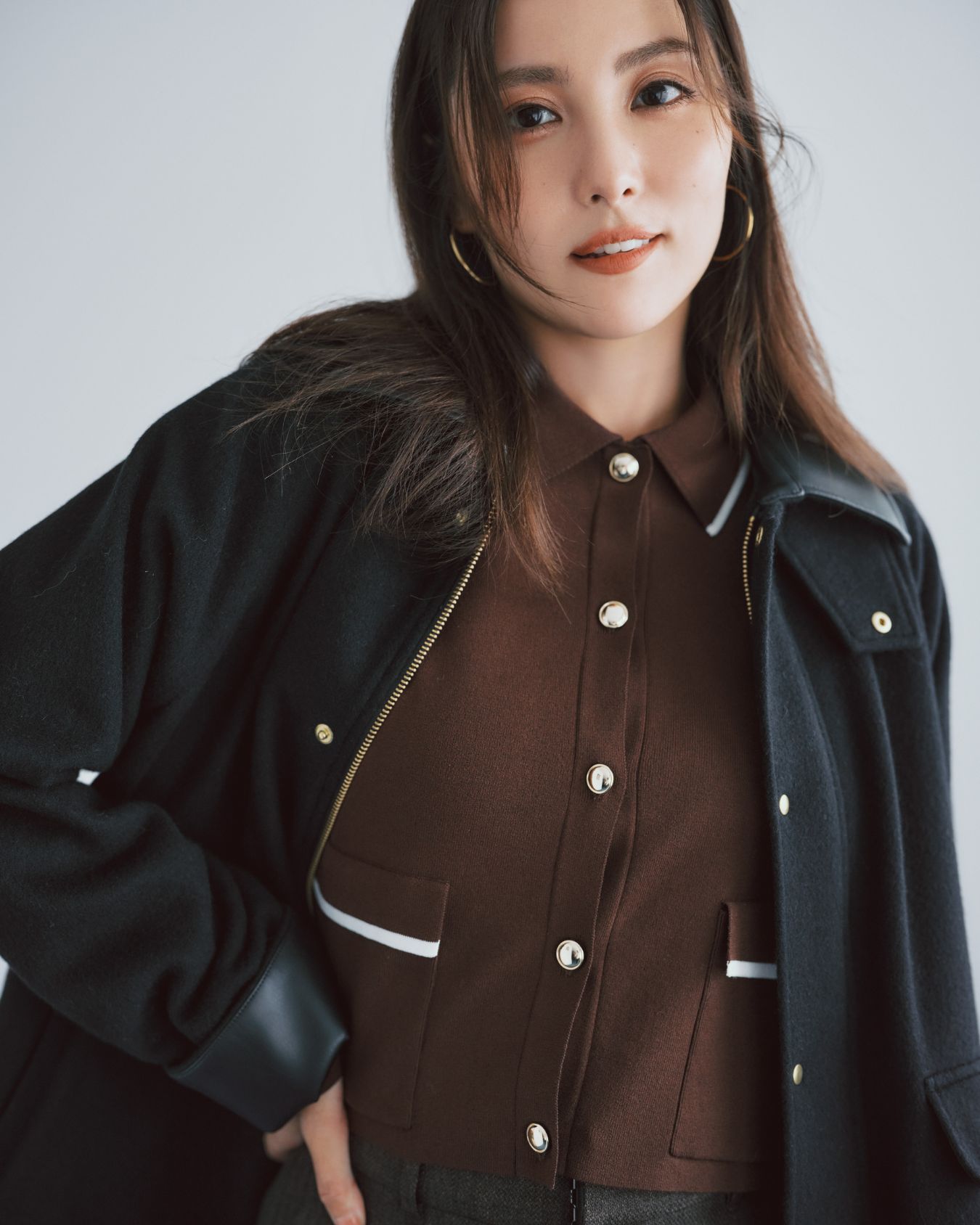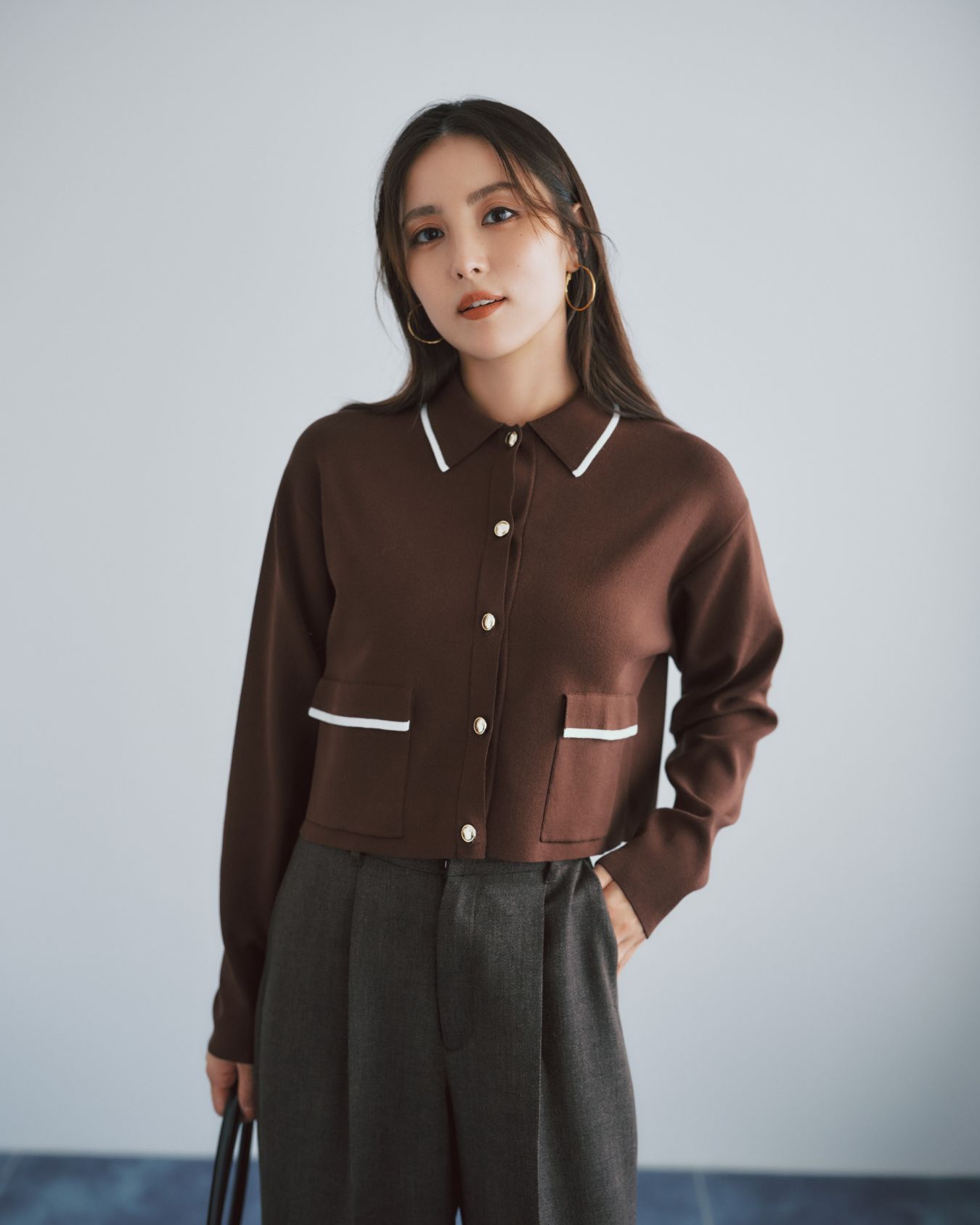 レザーの衿がアクセントのカシミヤ混のウールコート、ニットカーディガンにウール調パンツ... 冬だからこそ楽しめる、表情のある素材をミックスして遊び心を。 シックなトーンなら品よくまとまる。