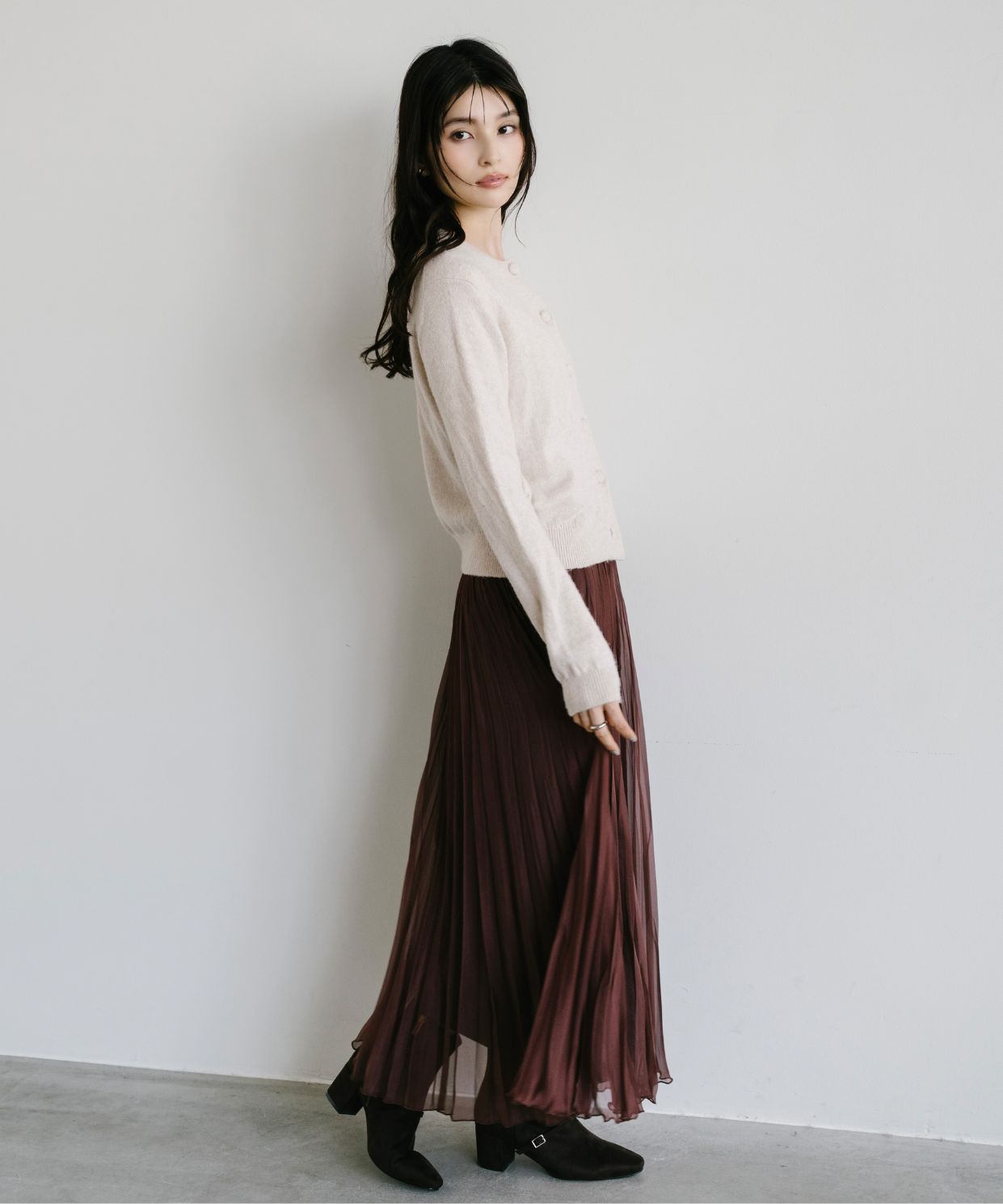 着用アイテム ショート丈ニットカーディガン ¥16,500 SIZE:38 ワッシャープリーツスカート ¥24,200 SIZE:38 ベルテッドショートブーツ ¥24,200 SIZE:38 ホーボー小型BAG ¥15,400 SIZE:00 ※着用商品以外はスタッフの私物になります
