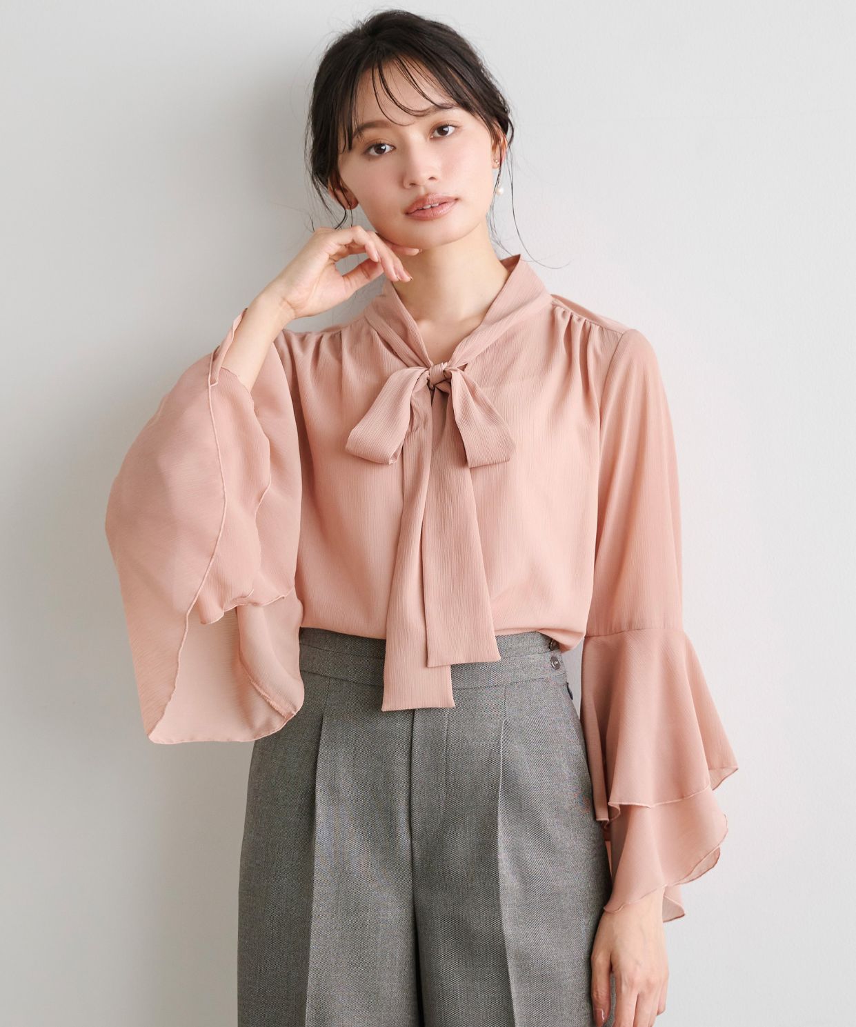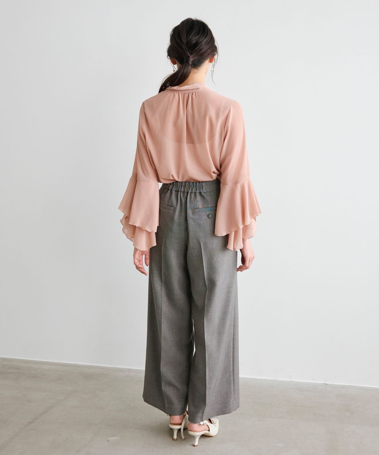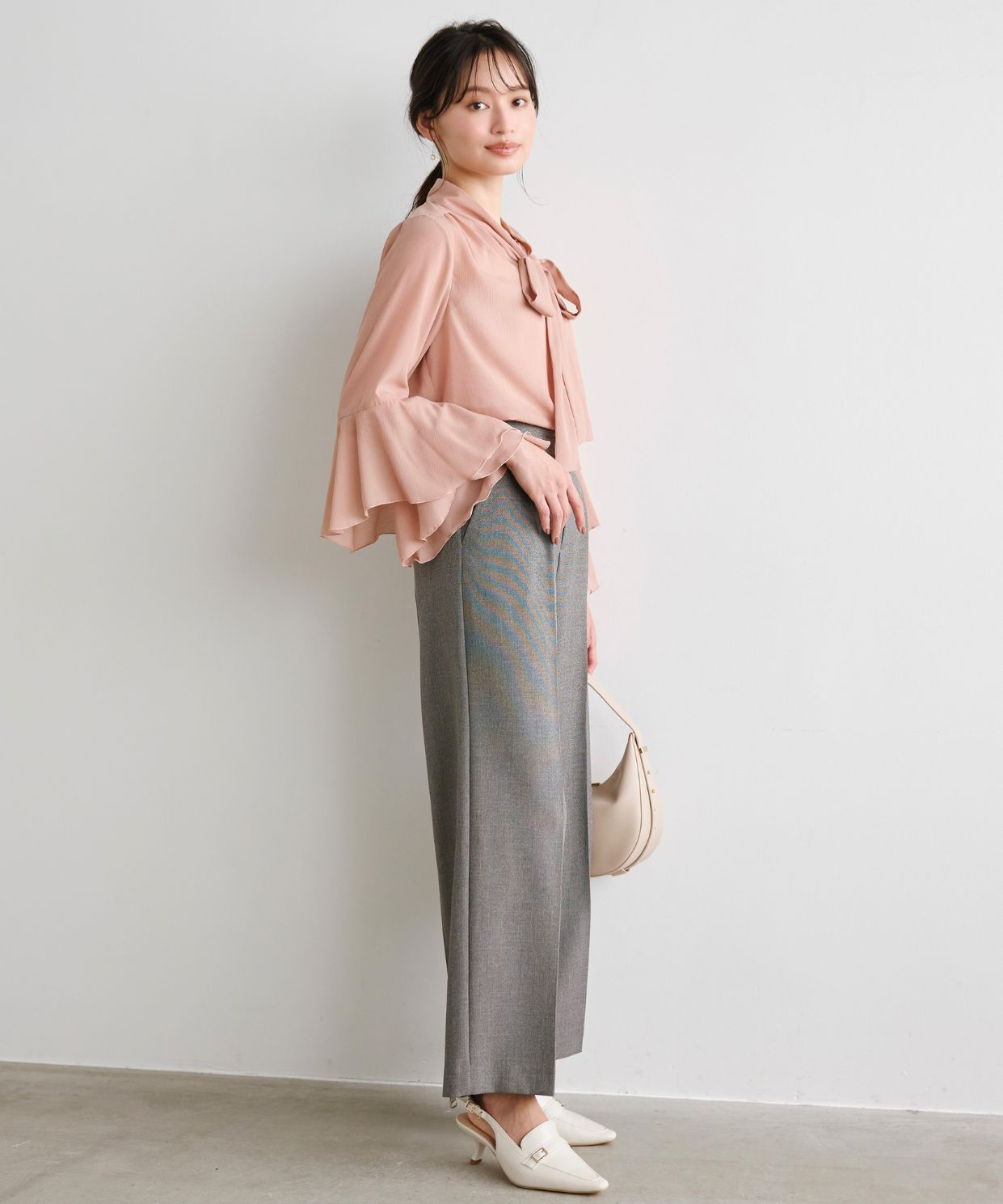 着用アイテム 袖フレアボウタイブラウス ¥17,600 SIZE:38 ウール調ややワイドパンツ ¥18,700 SIZE:38 バックストラップローファーミュール ¥18,700 SIZE:38 ※着用商品以外はスタッフの私物になります