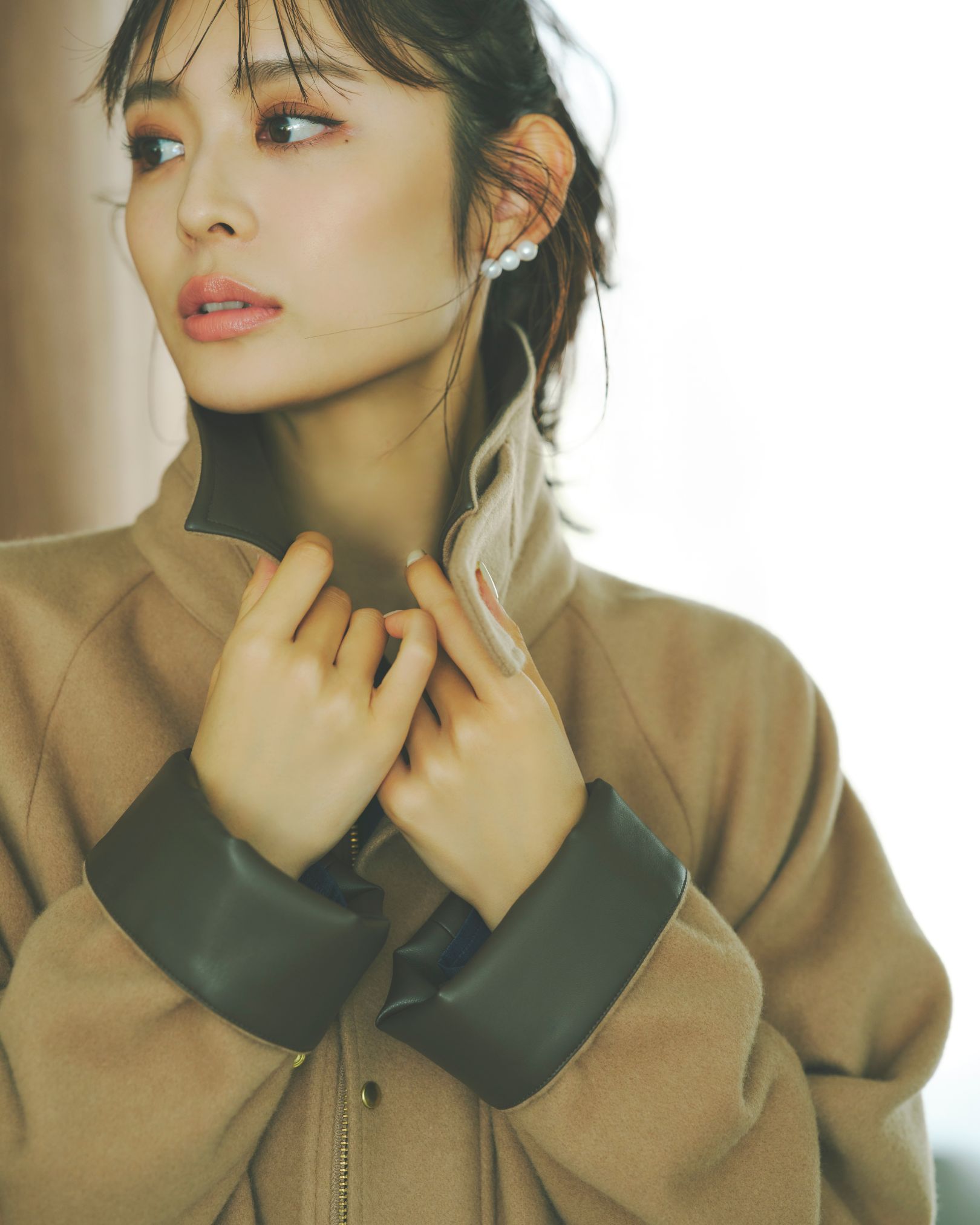 襟と袖口にレザー調の素材を取り入れた今年らしいデザインは、衿を立てた着こなしも◎ デニムコーデを瞬時に格上げ。