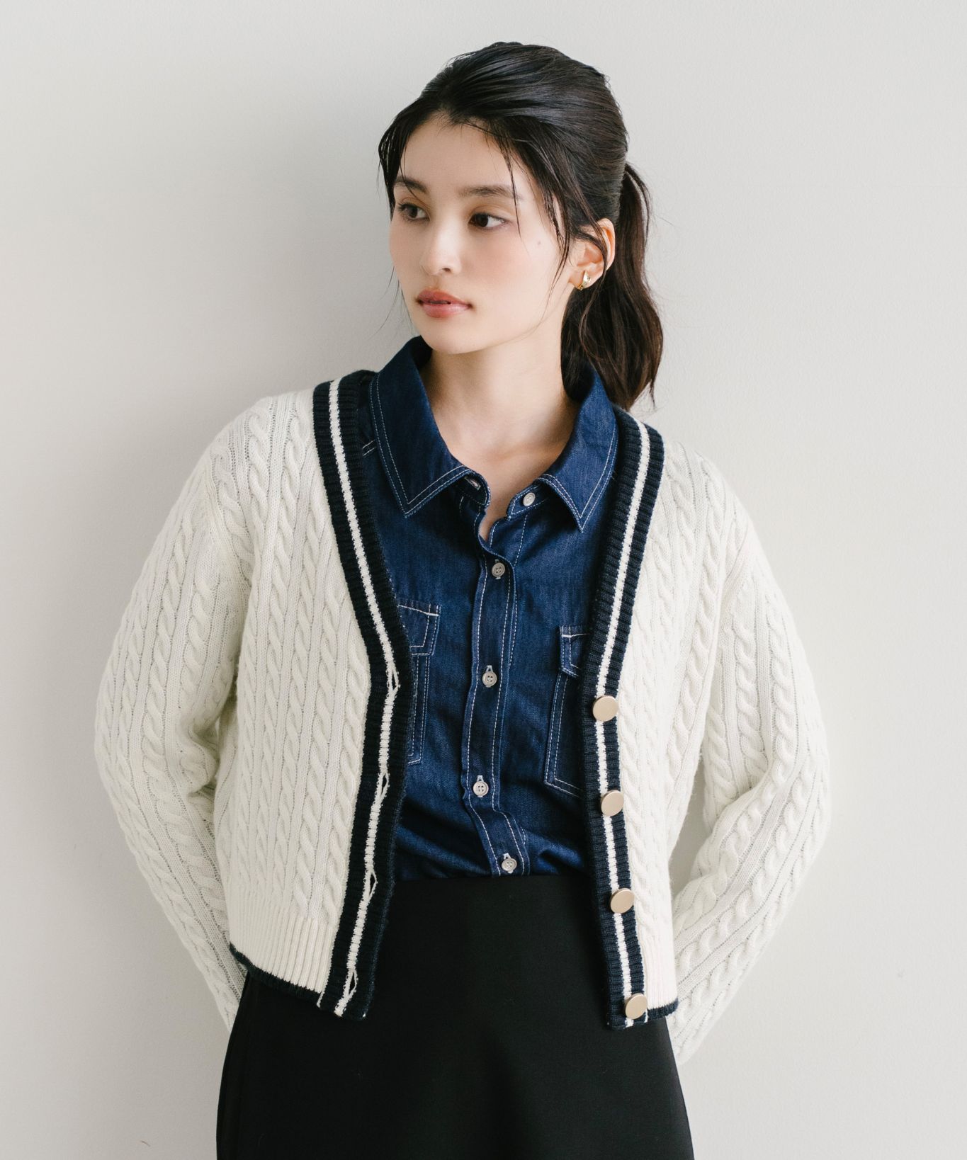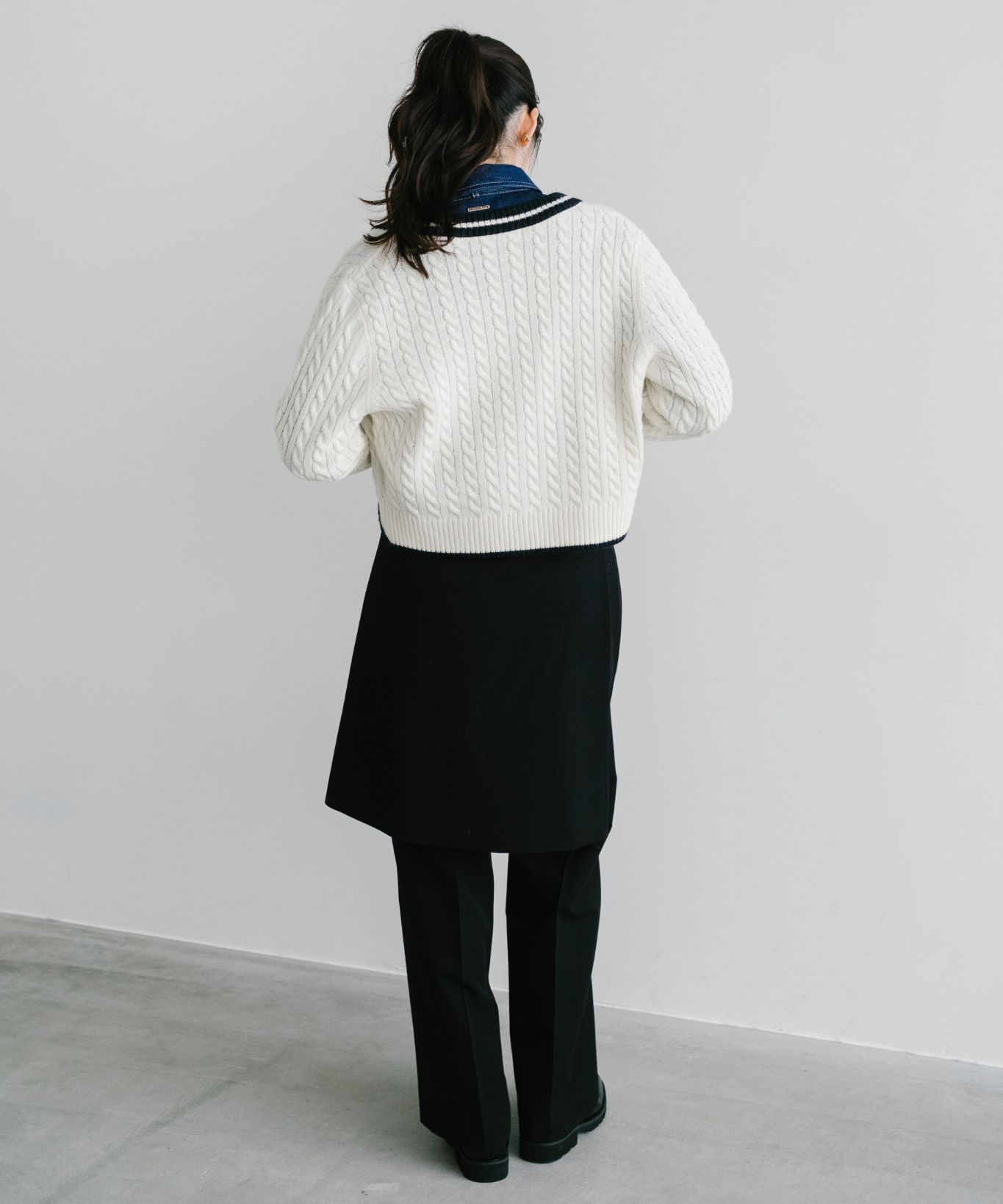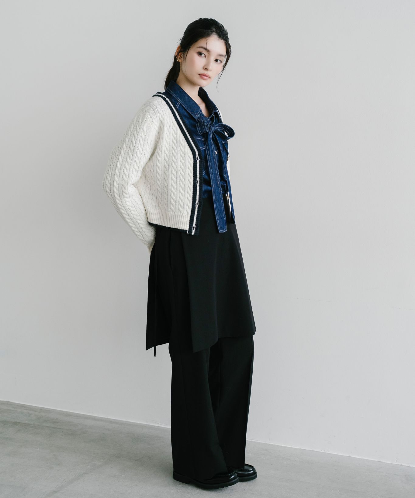 着用アイテム ケーブルショートニットカーディガン ¥18,700 SIZE:38 デニムボウタイシャツ ¥19,800 SIZE:38 2WAY巻きスカート付きストレートパンツ ¥24,200 SIZE:38 ※着用商品以外はスタッフの私物になります