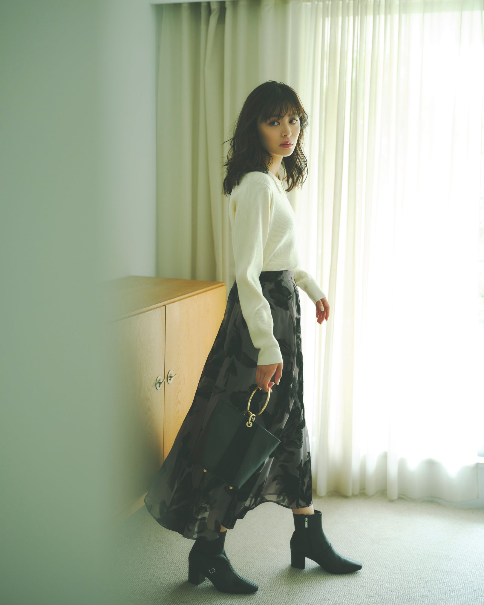 トレンドの衿つきニットも優美な装飾で華やかな表情が実現。 フロッキープリントのフレアスカートを合わせて、さらに印象的に。