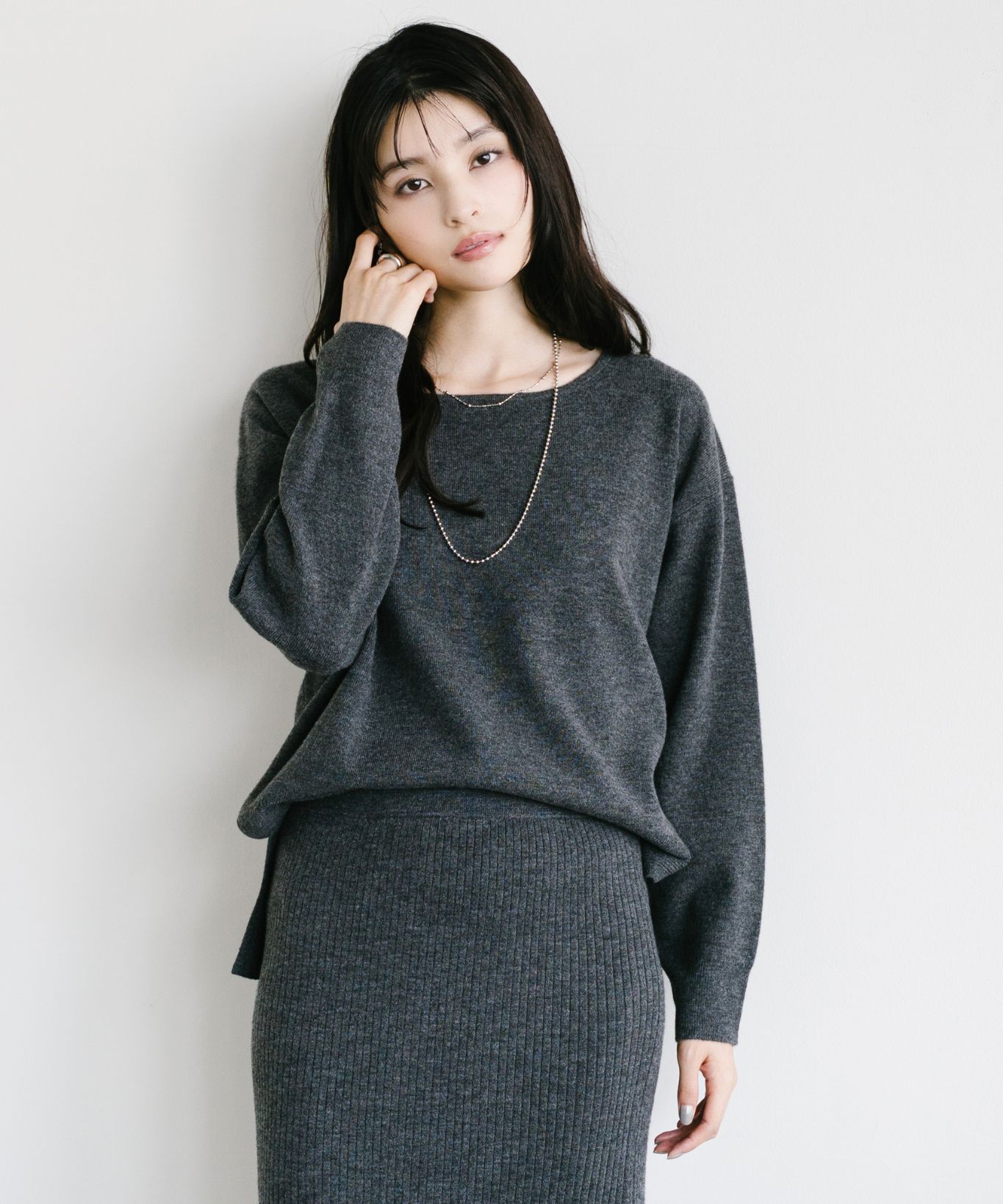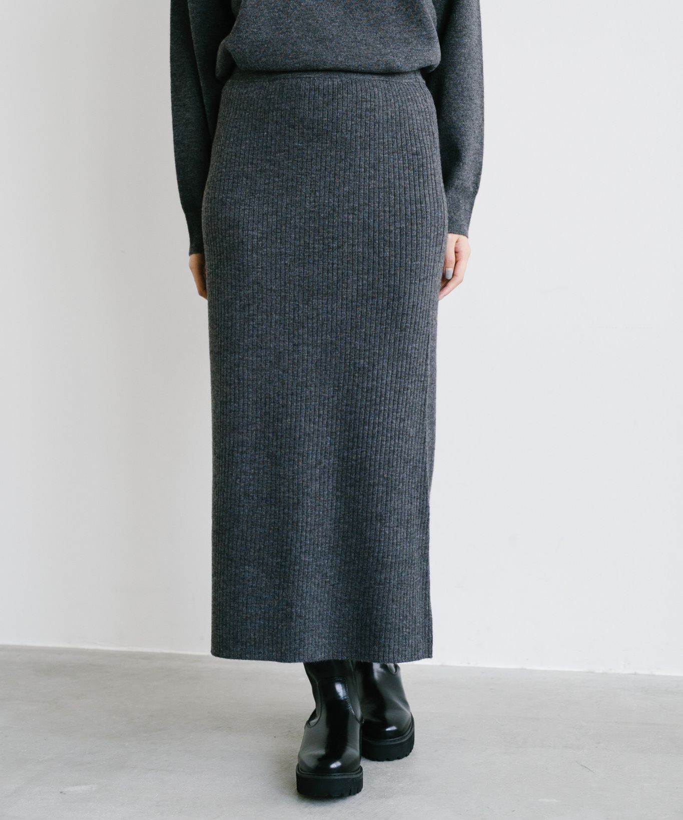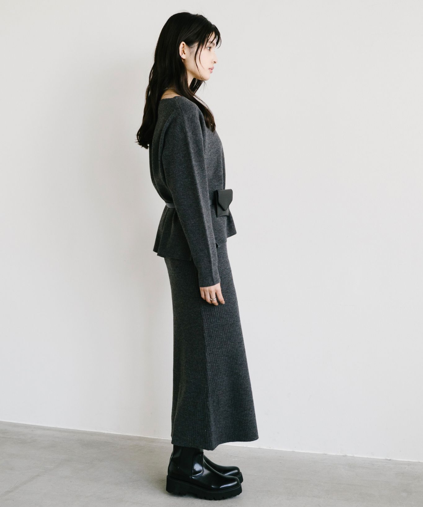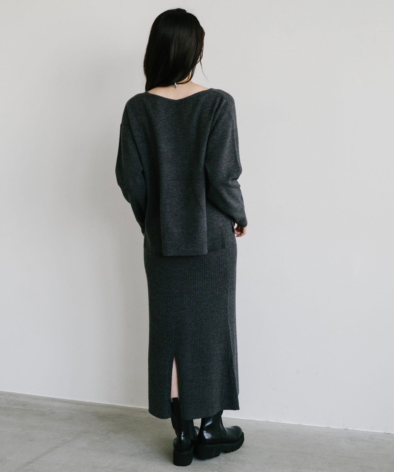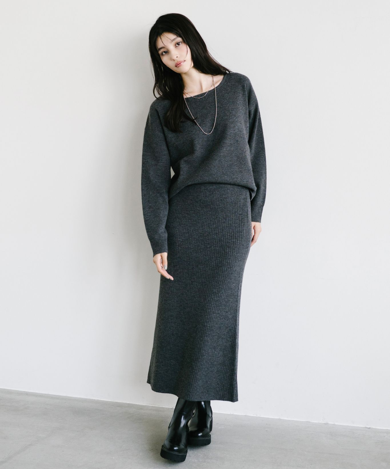 着用アイテム ボートネックプルオーバー+マーメイドスカートセット ¥29,700 SIZE:38 切り替えサイドゴアブーツ ¥25,300 SIZE:38 マルチWAYボールチェーンネックレス ¥8,580 SIZE:00 ※着用商品以外はスタッフの私物になります