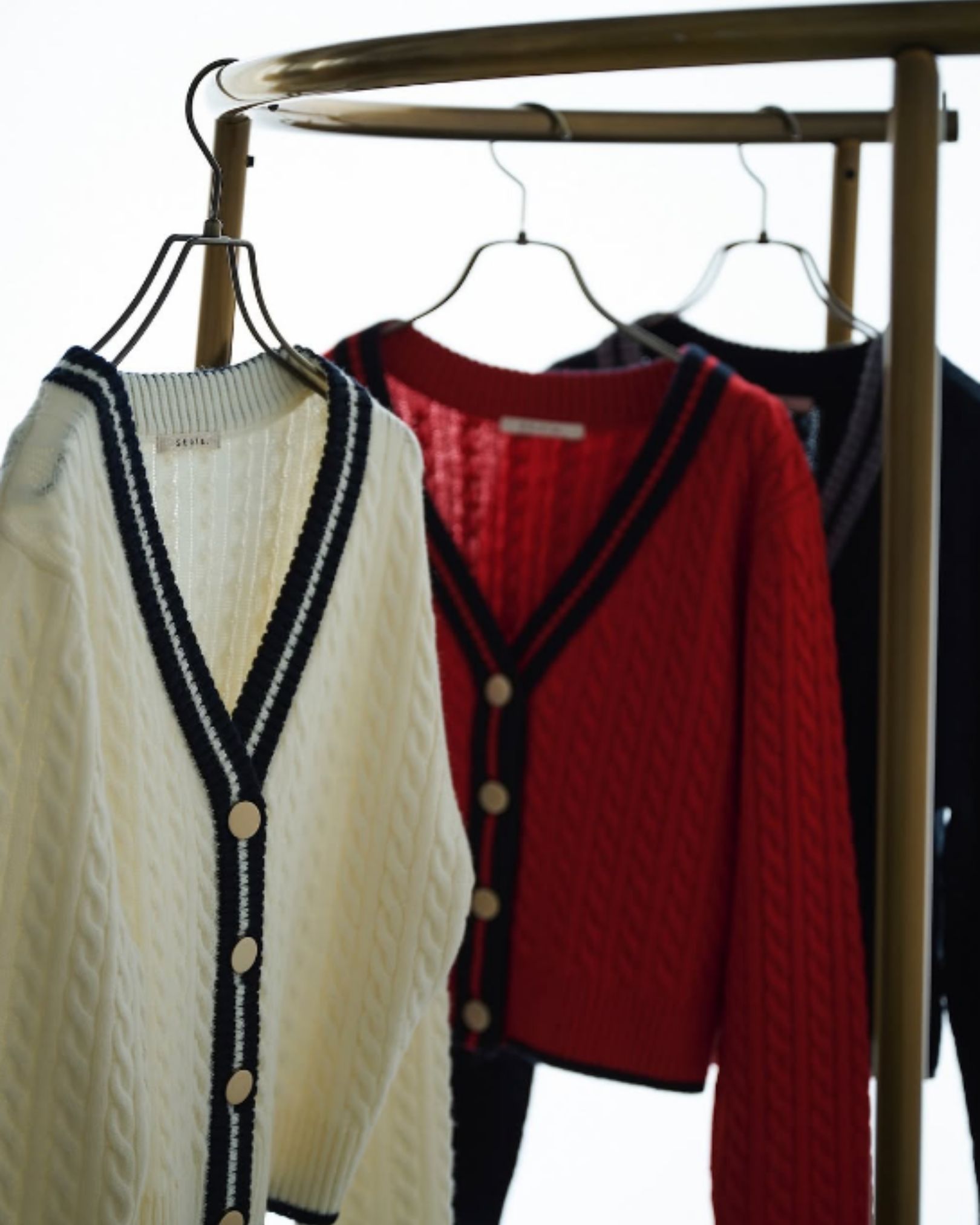 トラッドなケーブルニットカーディガンを旬の赤で今っぽく。 首もとからフリルをのぞかせてデニムコーデに可愛げを。