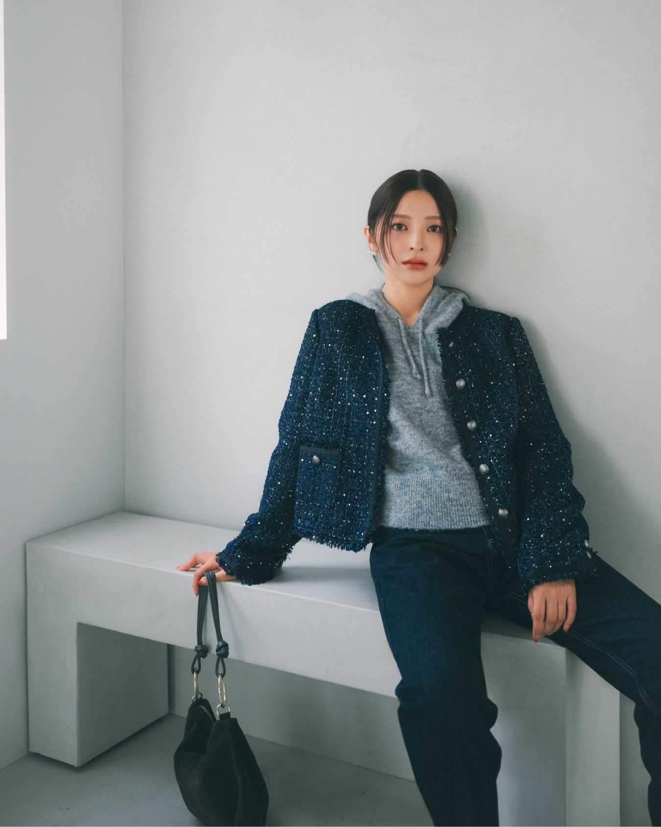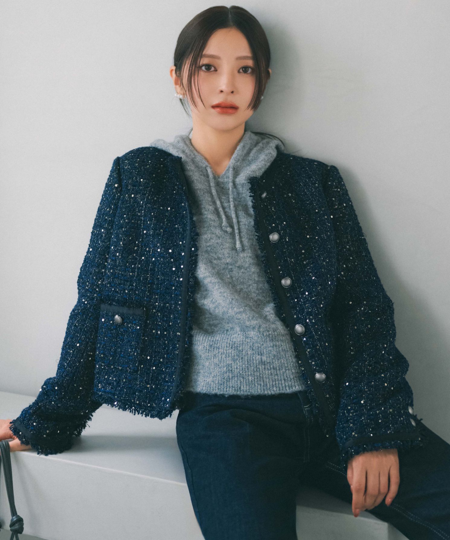 ウール混の柔らかな素材ときらめくツイードがデニムスタイルを格上げ
