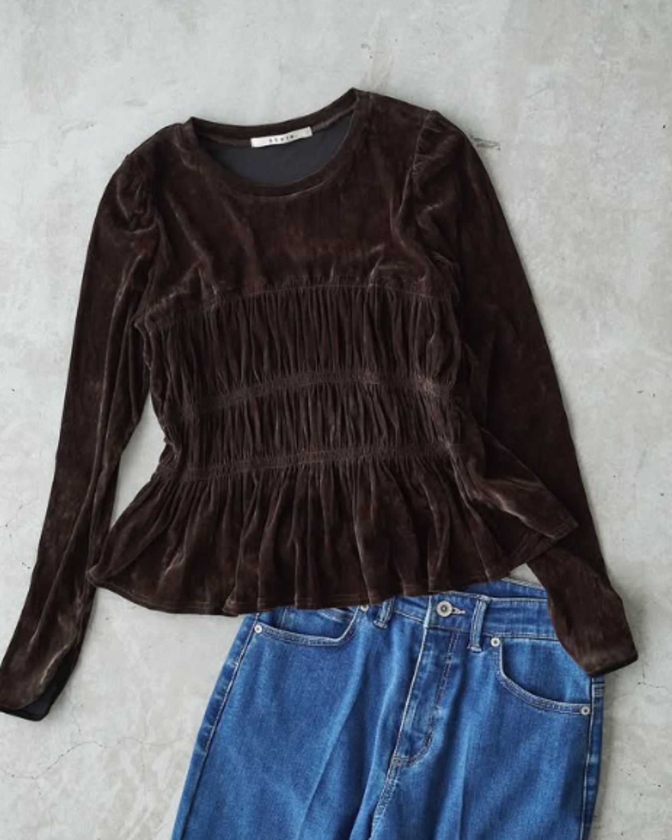ベロア素材ならではのぬくもりと光沢が、パンツスタイルを特別感のある着こなしに格上げ