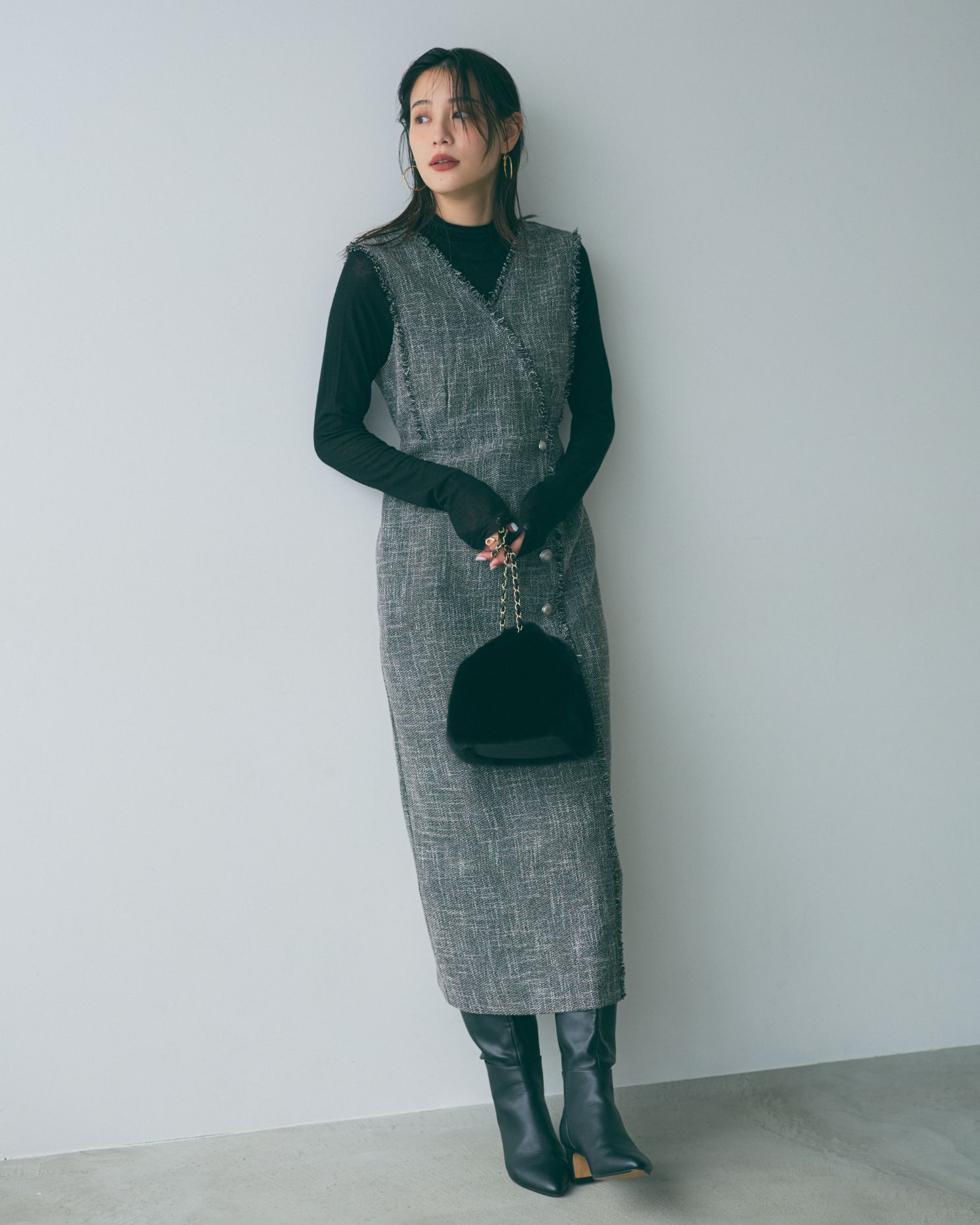 ほどよくボディラインに沿うIラインシルエットと、ウエスト位置が自然と高く見える切り替え位置にこだわりました。