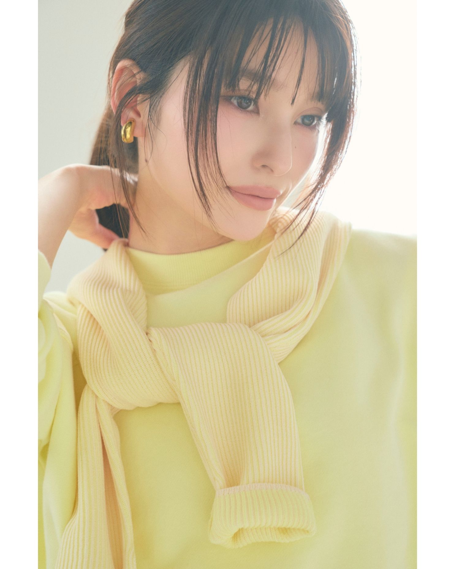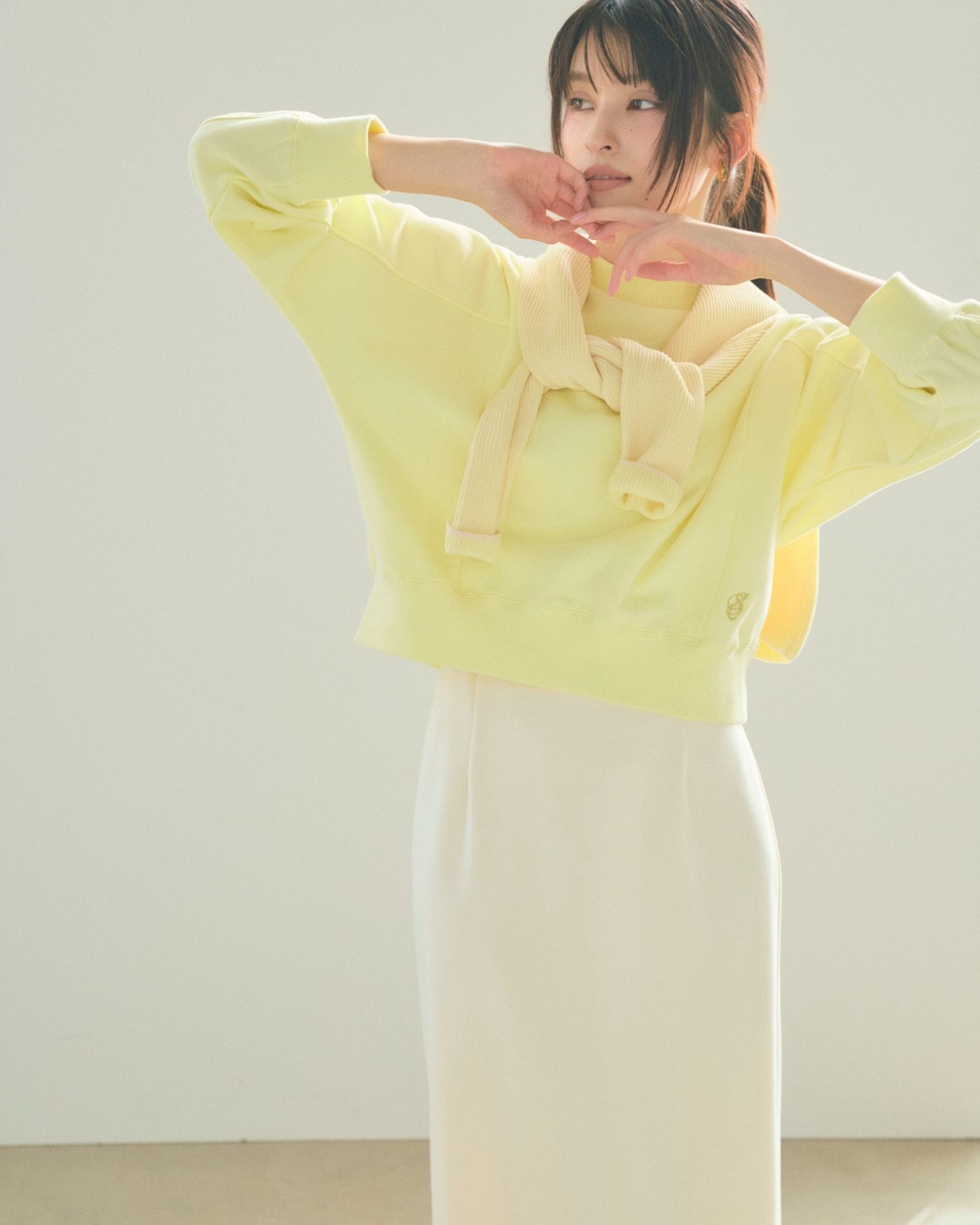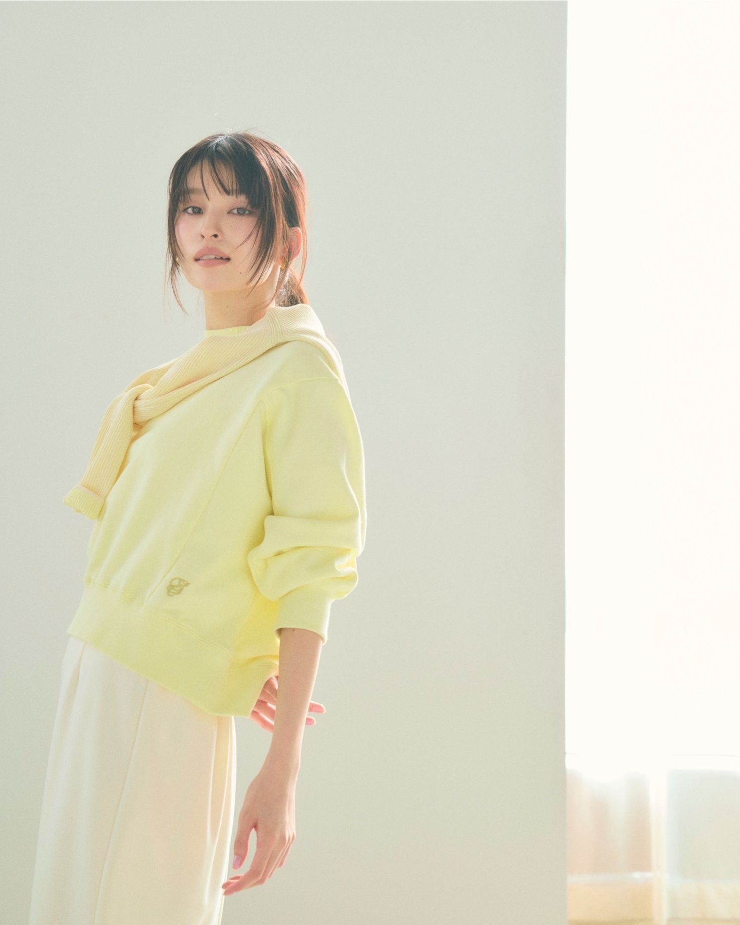 トレンドカラーのイエローは、ホワイト合わせで晴れやかな印象に。 シンプルなスタイリングも、裾にあしらったラメ糸のロゴ刺繍がさりげないアクセントとして映える。