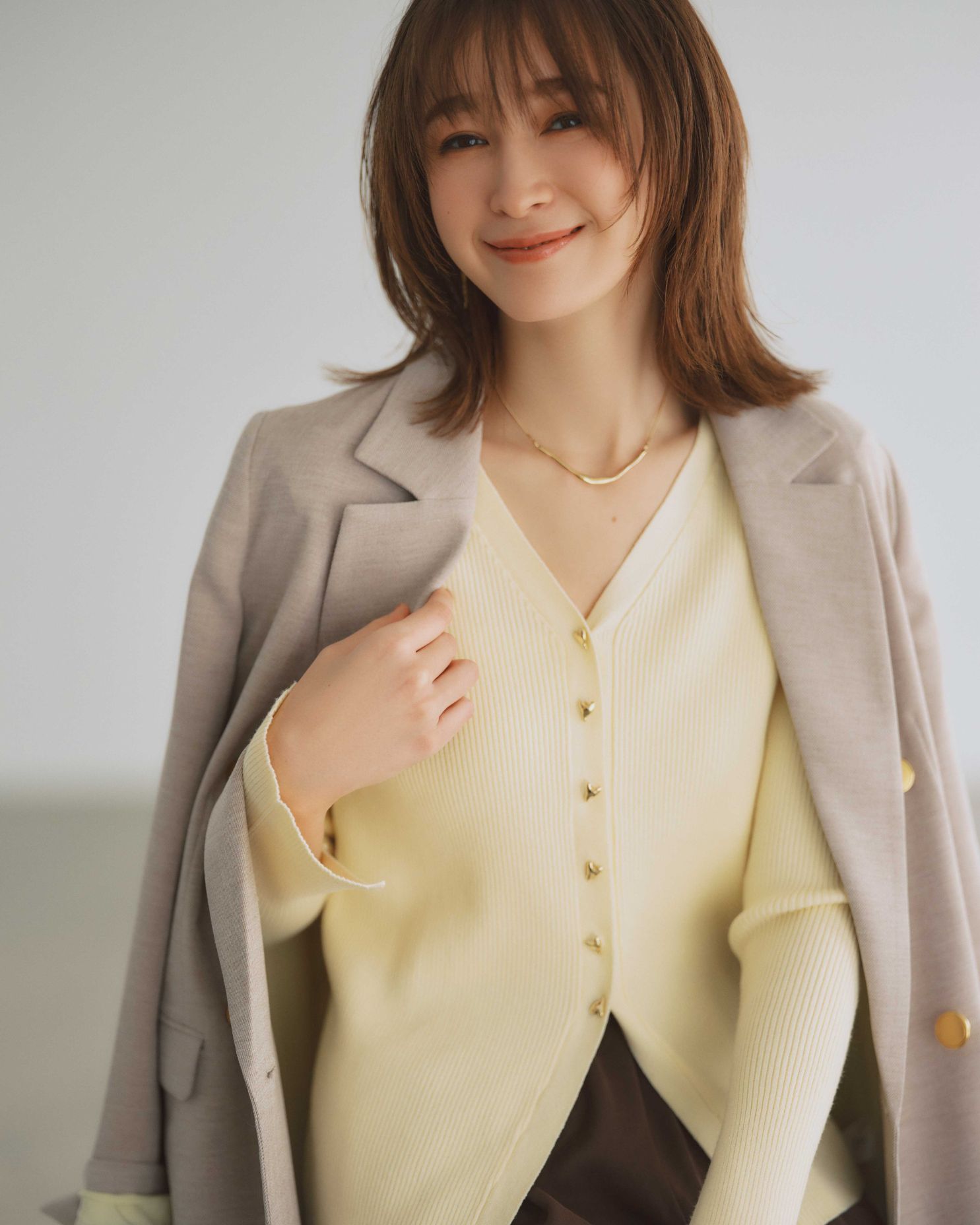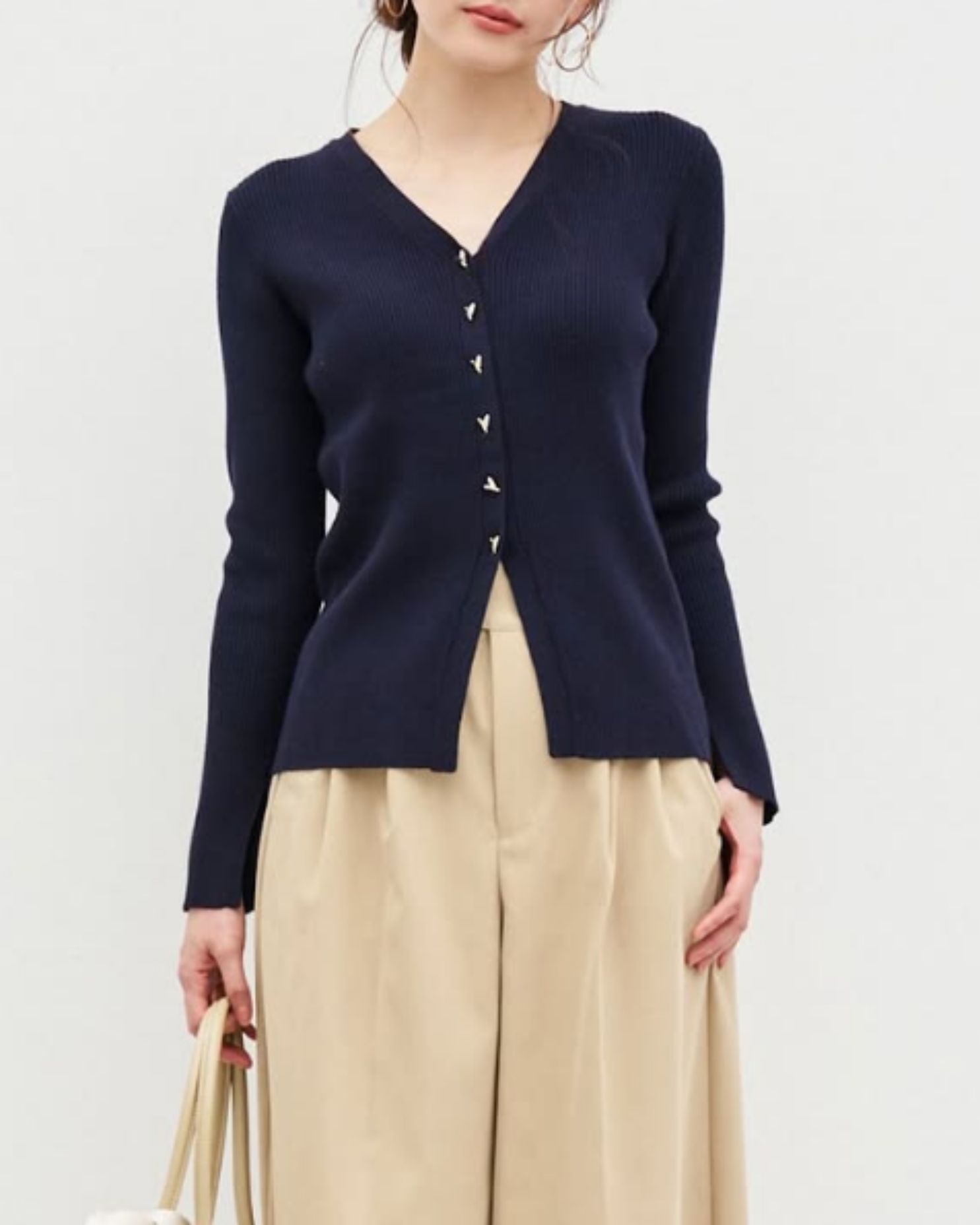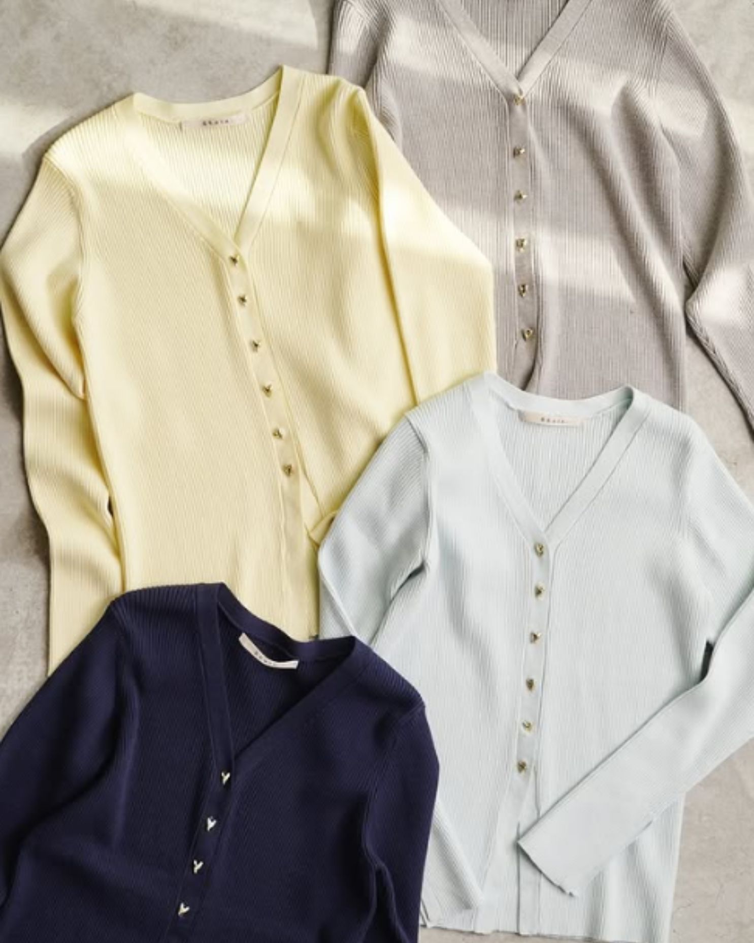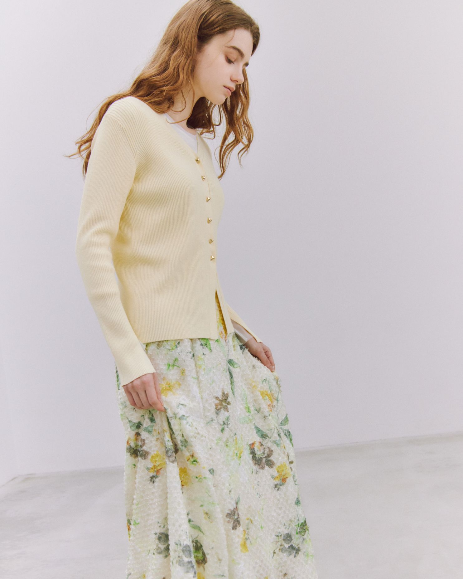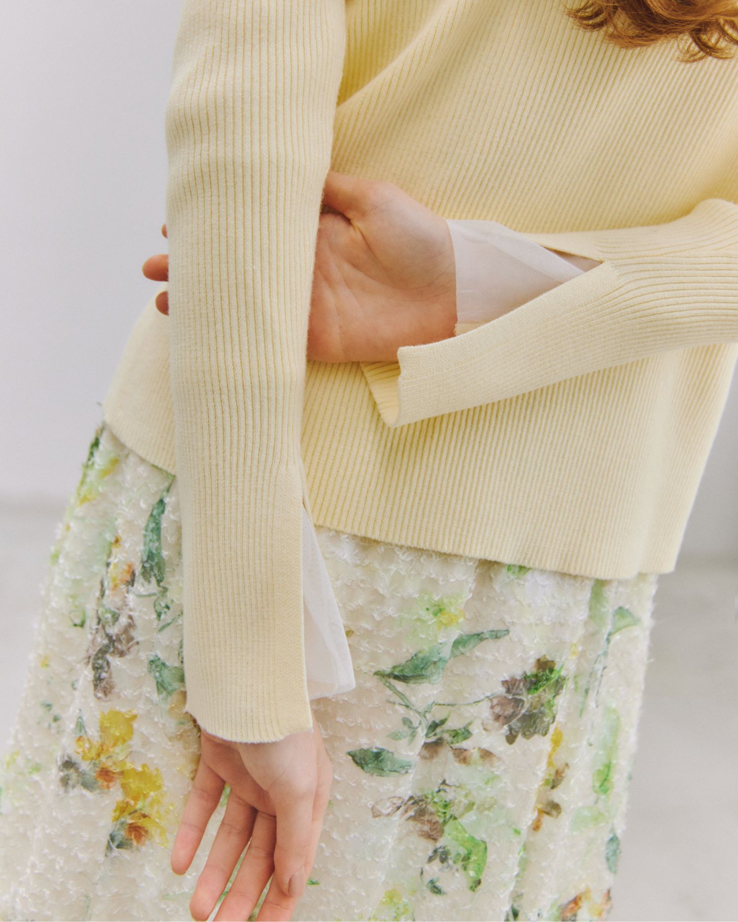 インナーが見えないVネックと、着るだけで自然に開く裾のデザインにこだわった、プルオーバーとして楽しんでいただきたい1着です。 トレンドカラーのイエロー、春気分を先取りするライトブルー、ハート釦が引き立ちベーシックに着回せる杢グレー&ネイビーの全4色展開。 Point ☑︎すっきり見えてピチピチしない、肉感のあるリブニット ☑︎フィット&フレアでウエスト位置を高く見せてくれるから、トップスをINしなくてもバランス◎ ☑︎手元のスリットで抜け感&旬のレイヤードスタイルも楽しめる ☑︎ウォッシャブル素材