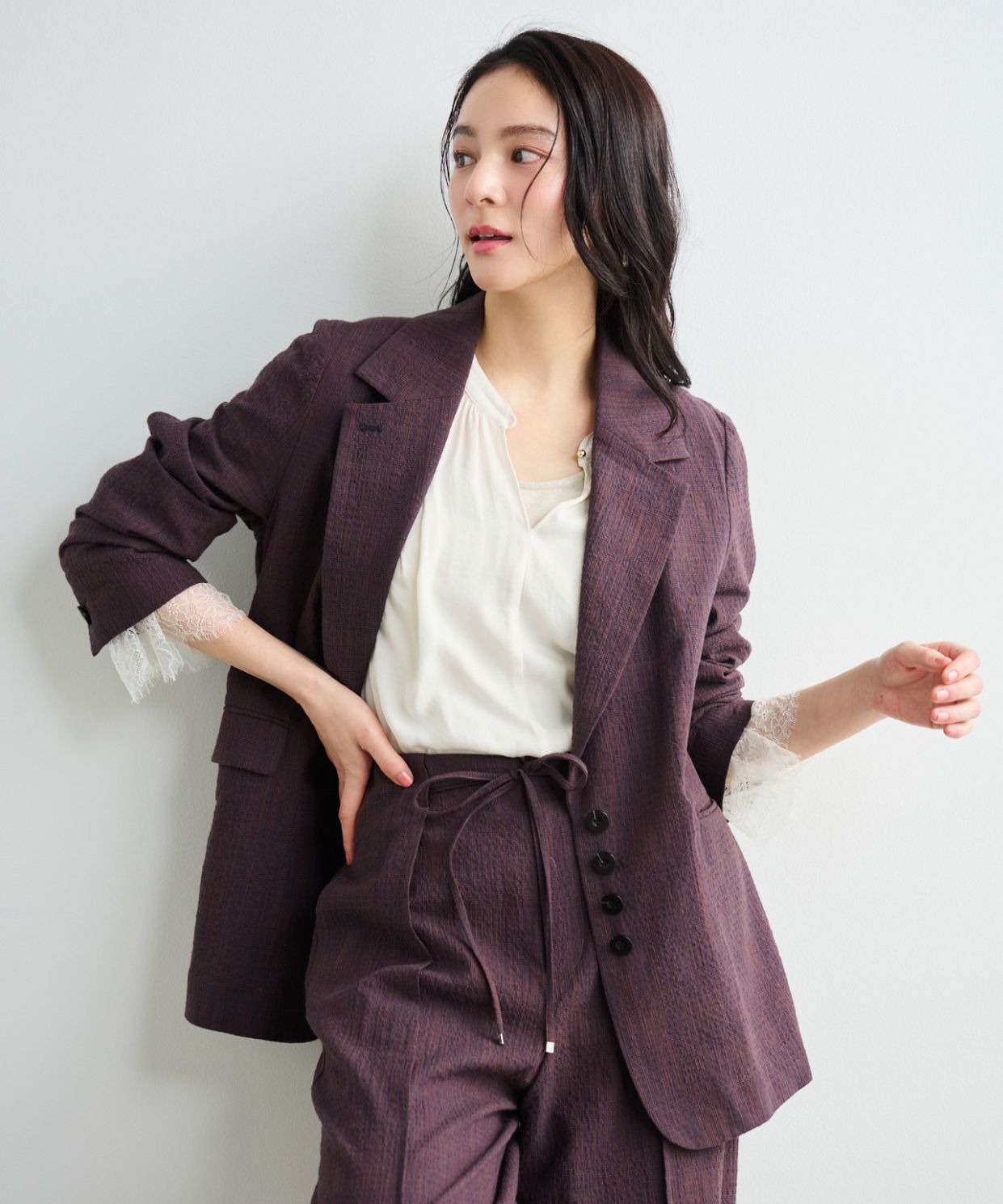着用アイテム 麻混素材シングルテーラードジャケット ¥27,500 SIZE:38 前後2WAY袖口レース割繊ブラウス ¥17,600 SIZE:38 麻混素材タックワイドパンツ ¥19,800 SIZE:38 シアーメッシュパンプス ¥18,700 SIZE:M 箱型催事バッグ ¥16,500 SIZE:00 ※着用商品以外はスタッフの私物になります