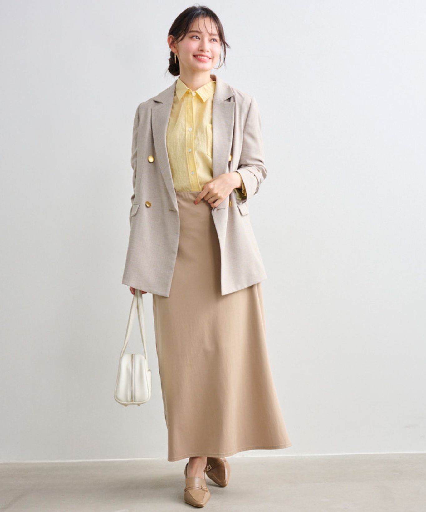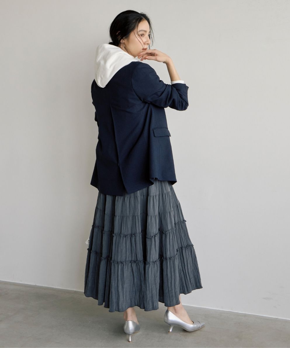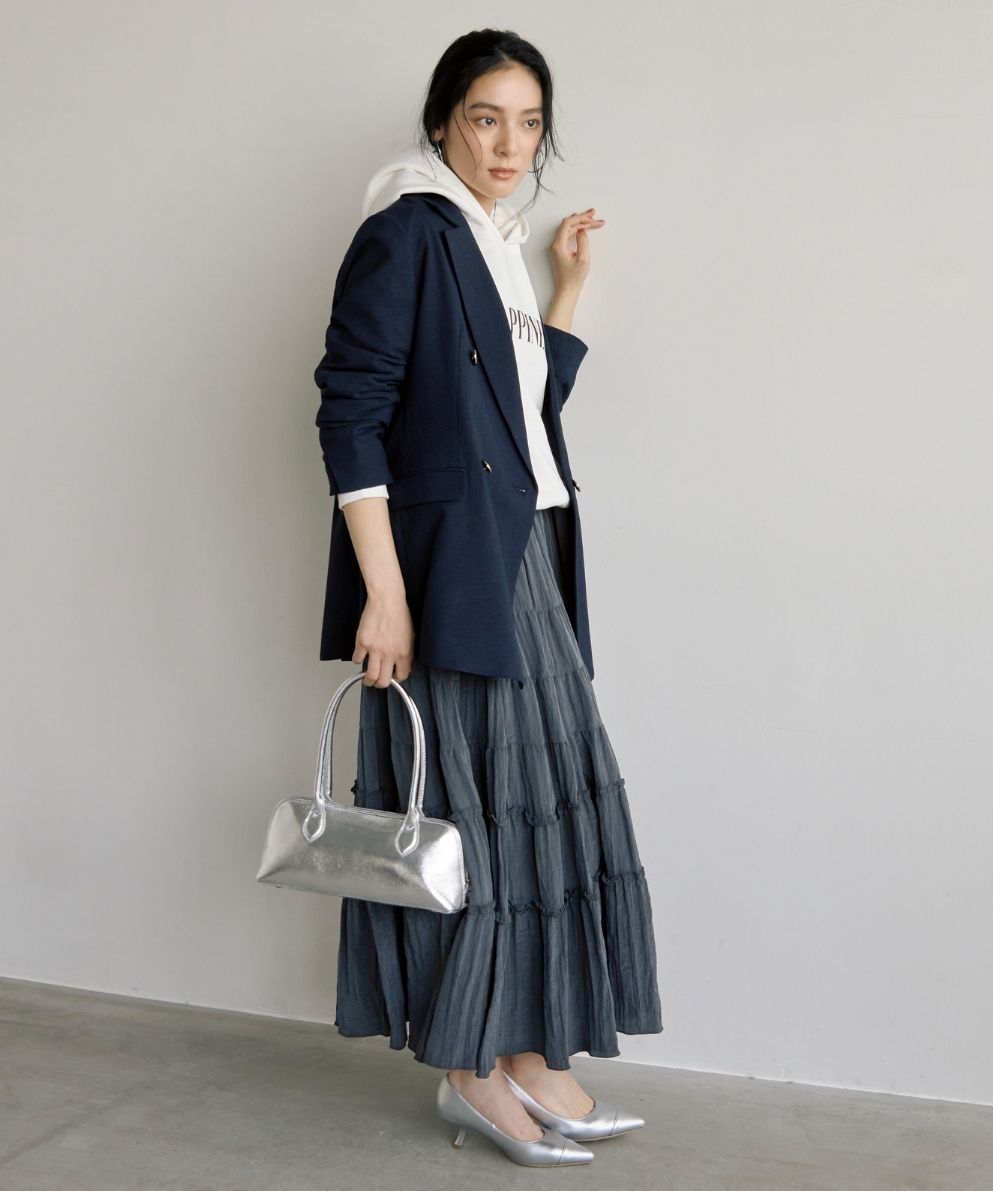 着用アイテム ダブルブレスト後ろ釦あきジャケット ¥31,900 SIZE:38 LIFE PICTURE/GOOD ROCK SPEEDコラボ フーディ ¥17,600 SIZE:38 クリンクル素材ティアードスカート ¥20,900 SIZE:38 トゥーキャップパンプス ¥18,700 SIZE:38 横長ボストンバッグ ¥17,600 SIZE:00 ※着用商品以外はスタッフの私物になります