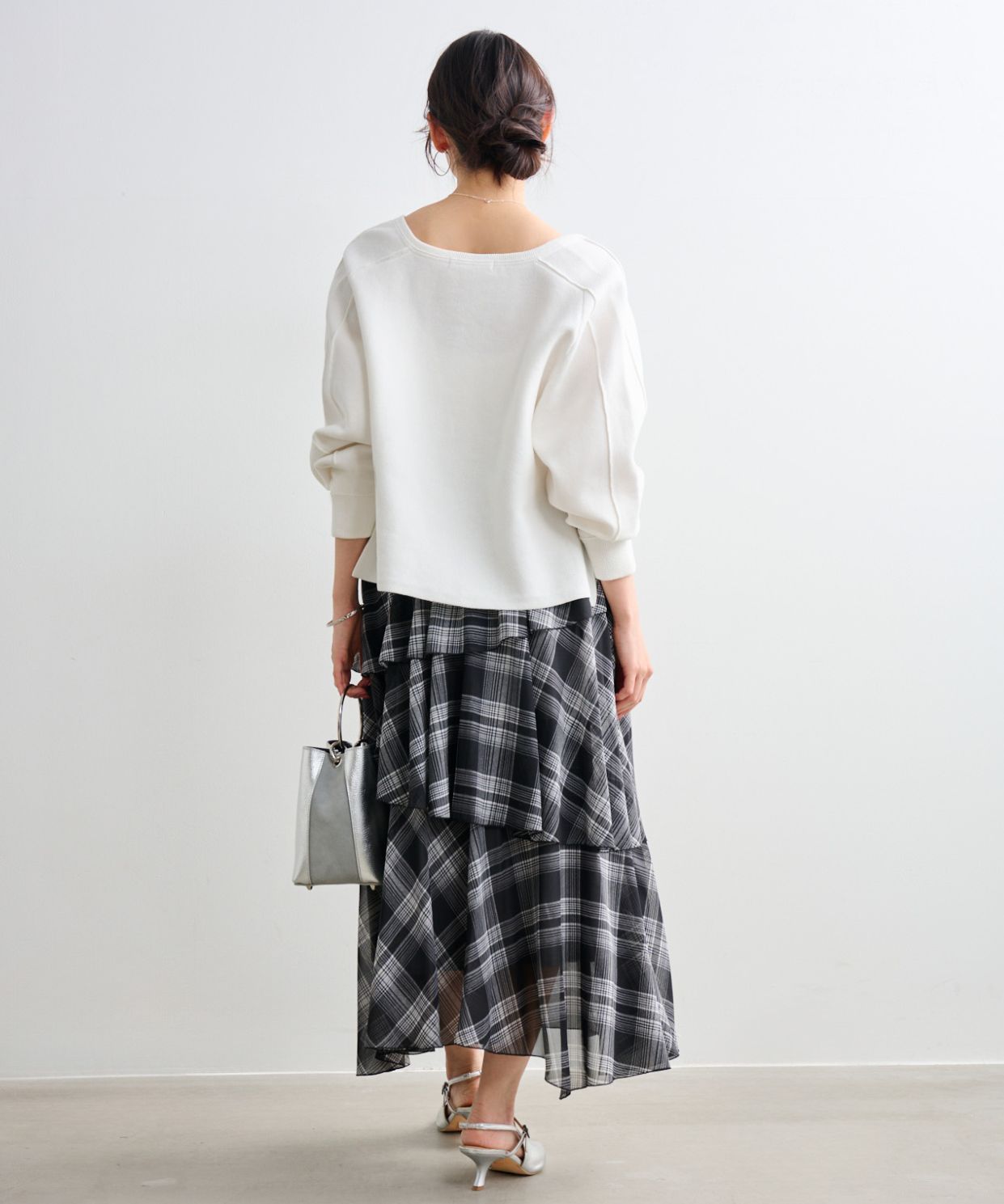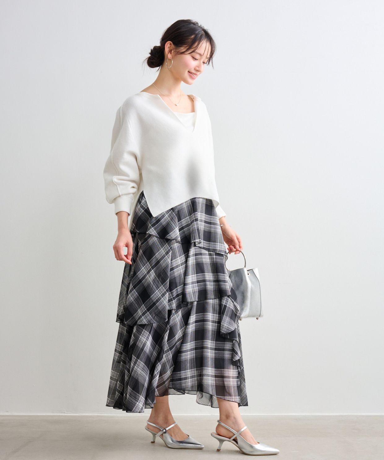 着用アイテム スリットネックニットプルオーバー ¥17,600 SIZE:38 フリルティアードスカート柄 ¥24,200 SIZE:38 【AULENTTI】リングハンドルレザーバッグ (Stola.別注色有り) ¥19,800 SIZE:00 ※着用商品以外はスタッフの私物になります