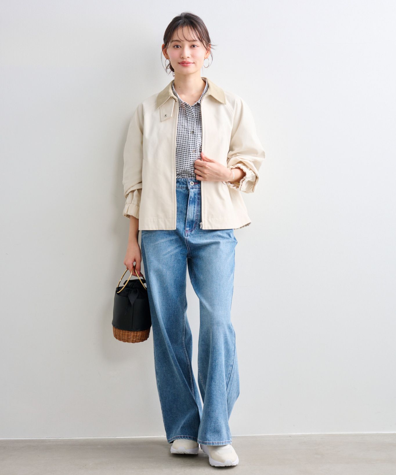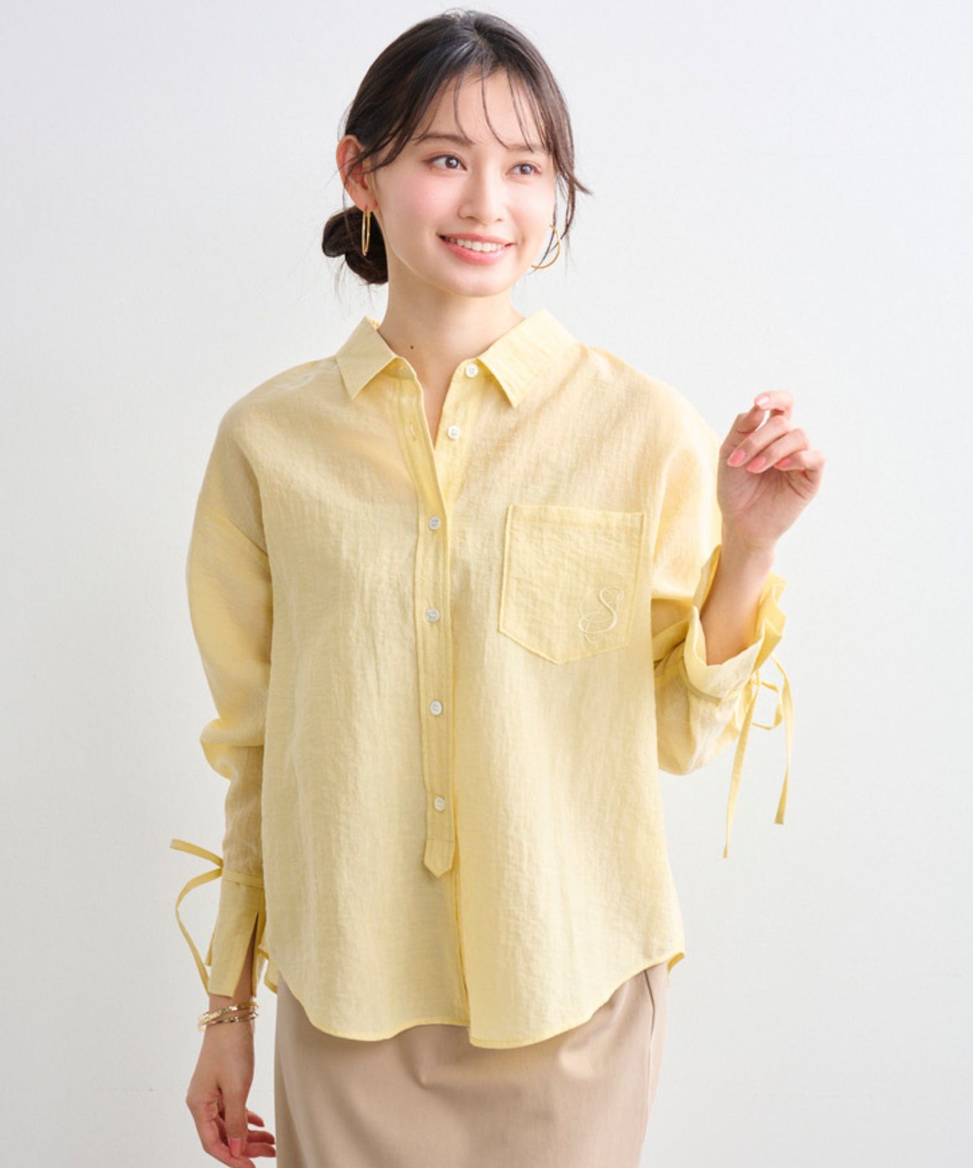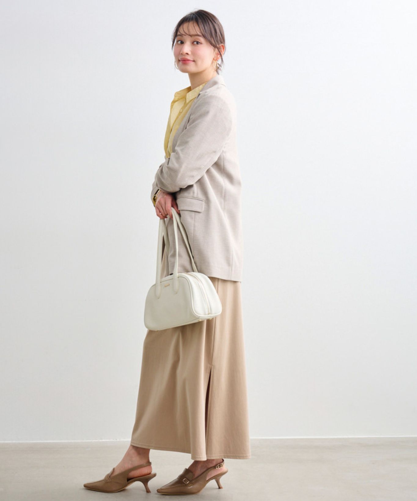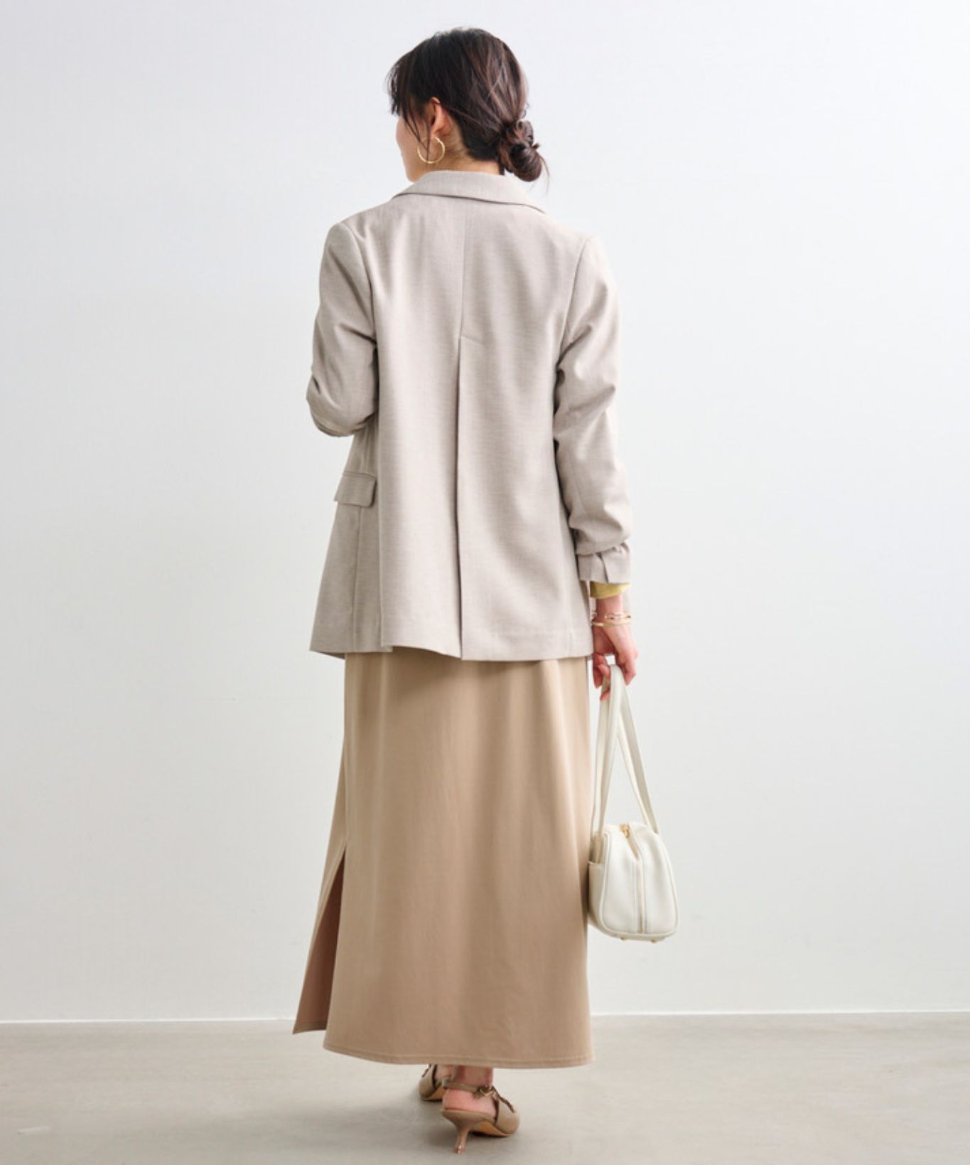 着用アイテム ダブルブレスト後ろ釦あきジャケット ¥31,900 SIZE:38 袖口リボンシャツ ¥18,700 SIZE:38 フィブリル素材ナロースカート ¥24,200 SIZE:38 ※着用商品以外はスタッフの私物になります