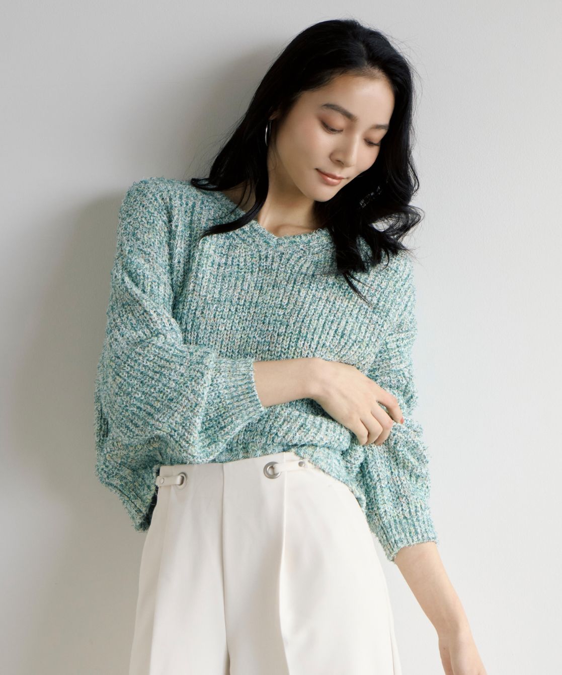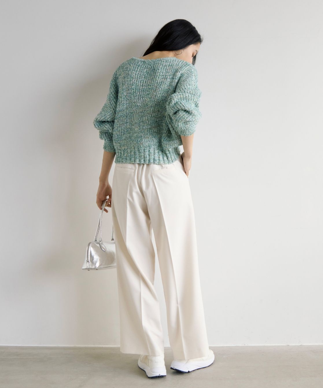 着用アイテム MIXヤーンニットプルオーバー ¥19,800 SIZE:38 ハトメ付きワイドパンツ ¥19,800 SIZE:38 デザインスニーカー ¥18,700 SIZE:M 横長ボストンバッグ ¥17,600 SIZE:00 ※着用商品以外はスタッフの私物になります