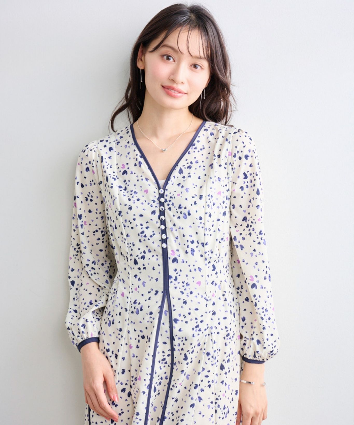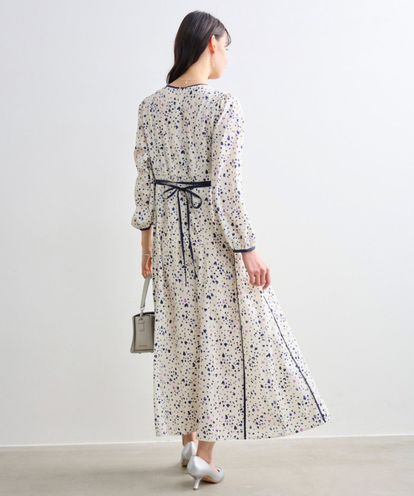 着用アイテム ハート柄プリントワンピース ¥27,500 SIZE:38 トゥーキャップパンプス ¥18,700 SIZE:38 箱型催事バッグ ¥16,500 SIZE:00 ※着用商品以外はスタッフの私物になります