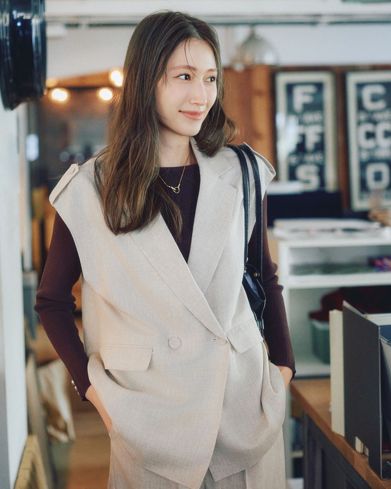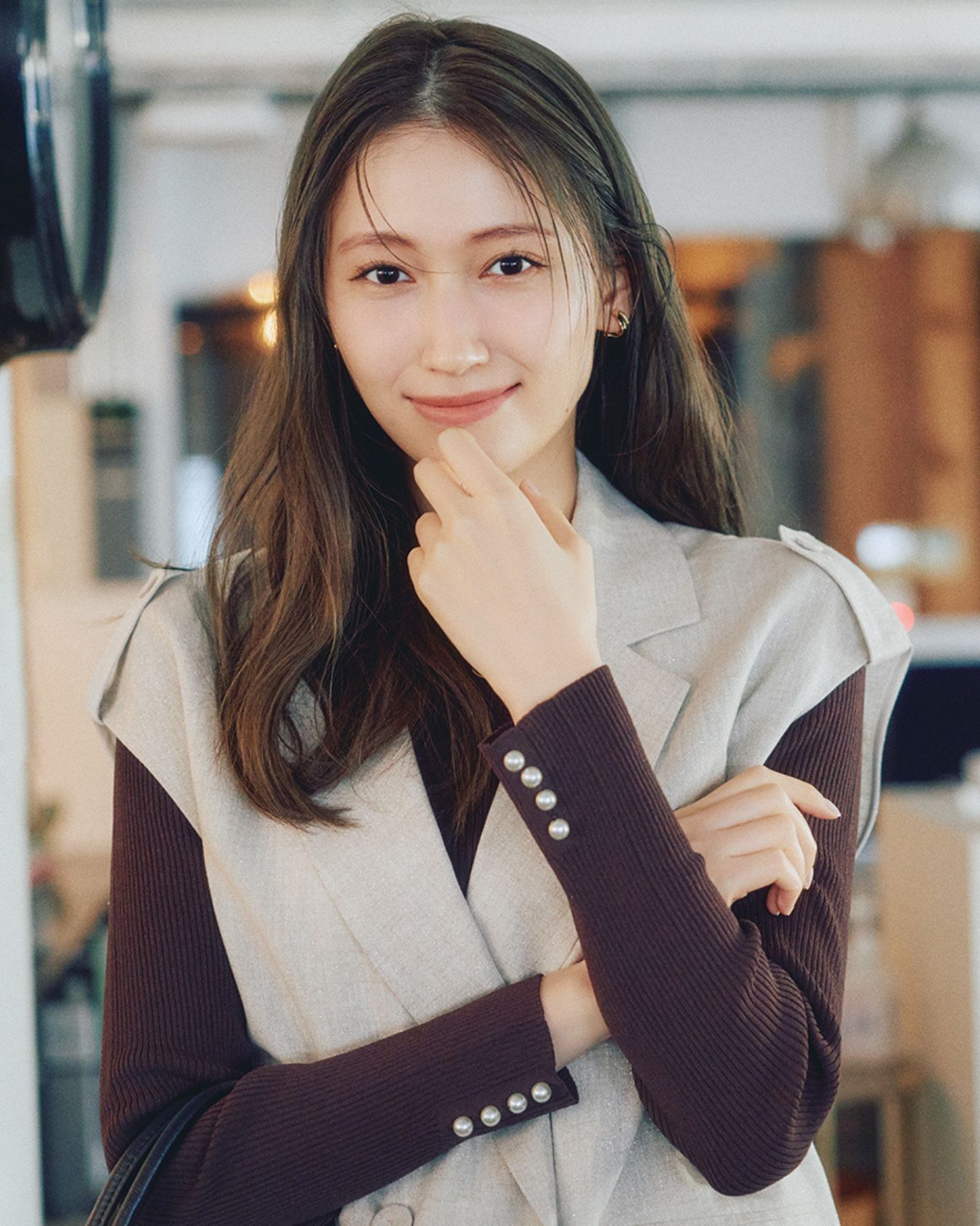 優しい色と微光沢ラメが好感度抜群のジレは同色&同素材のパンツとセットアップで楽しみたい。 繊細なさりげないラメ混がONスタイルにもぴったり。 パール付きのニットをインに仕込んで、ベーシックカラーながら華やかなスタイルに。