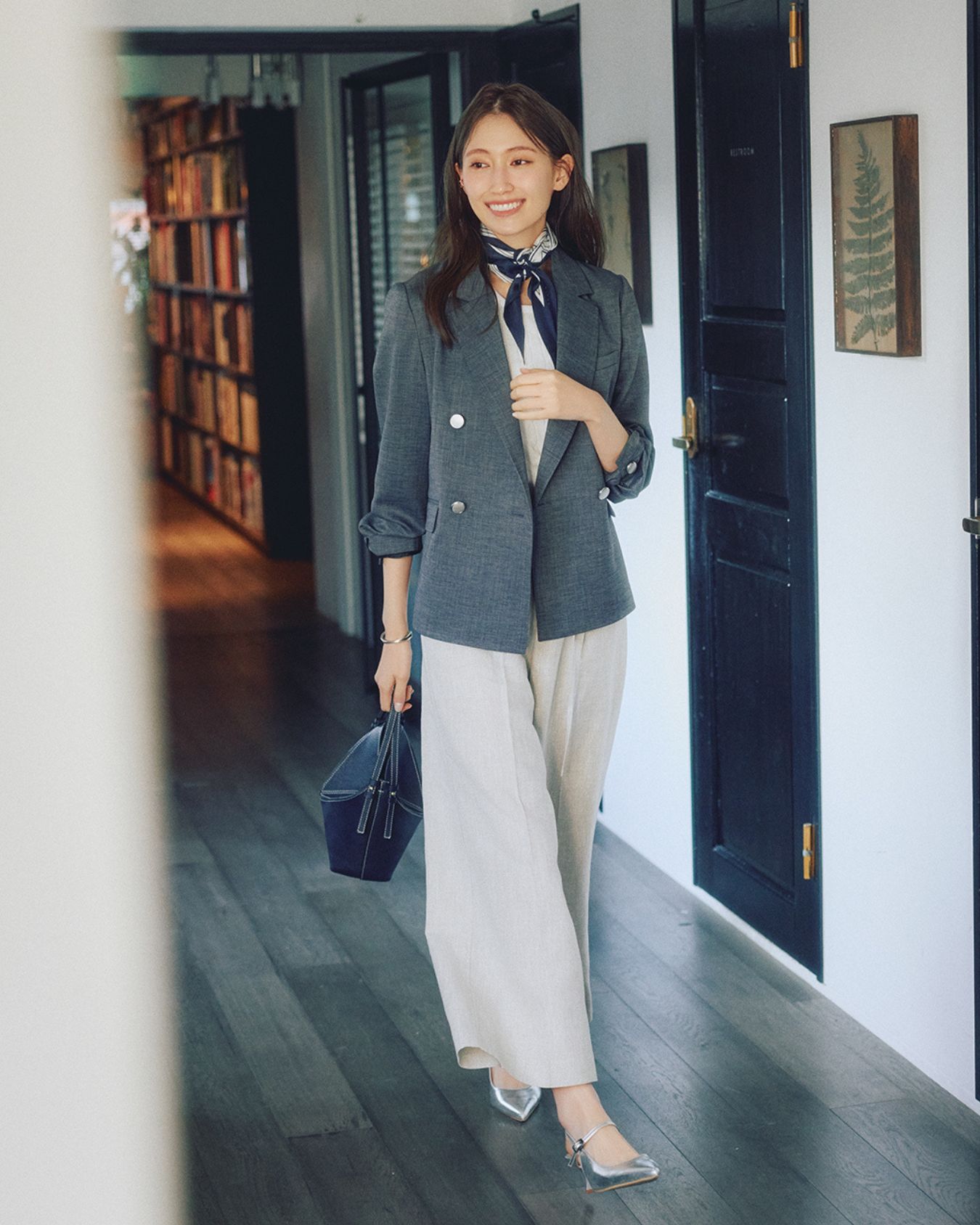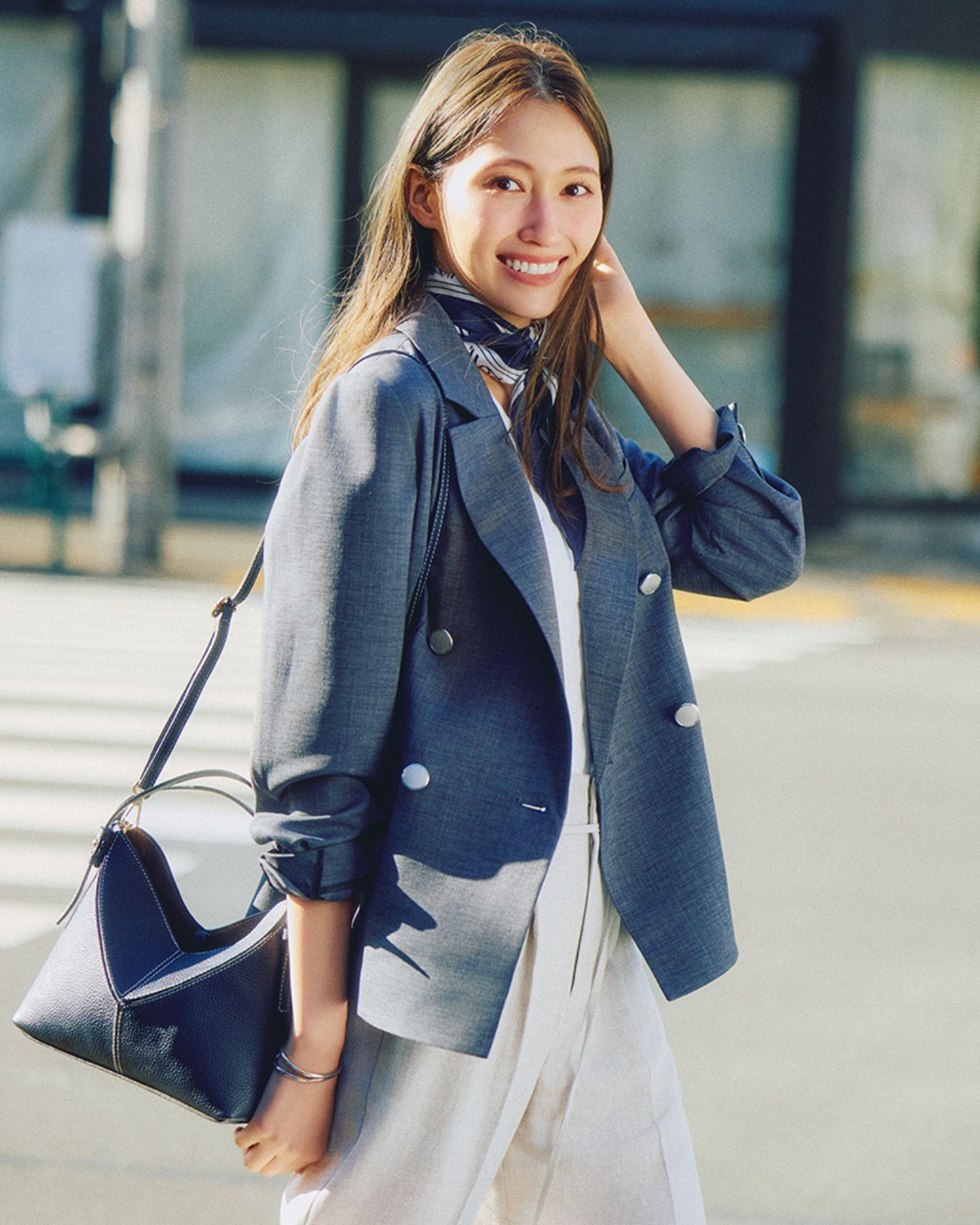さらりと羽織るだけでサマになるボクシーなグレージャケットに、センタープレス入りのワイドパンツを合わせてより洗練度高く。 UVカットや接触冷感機能を備えたドライタッチな素材で常に心地よく、クリーンな印象をキープできるのも嬉しい。
