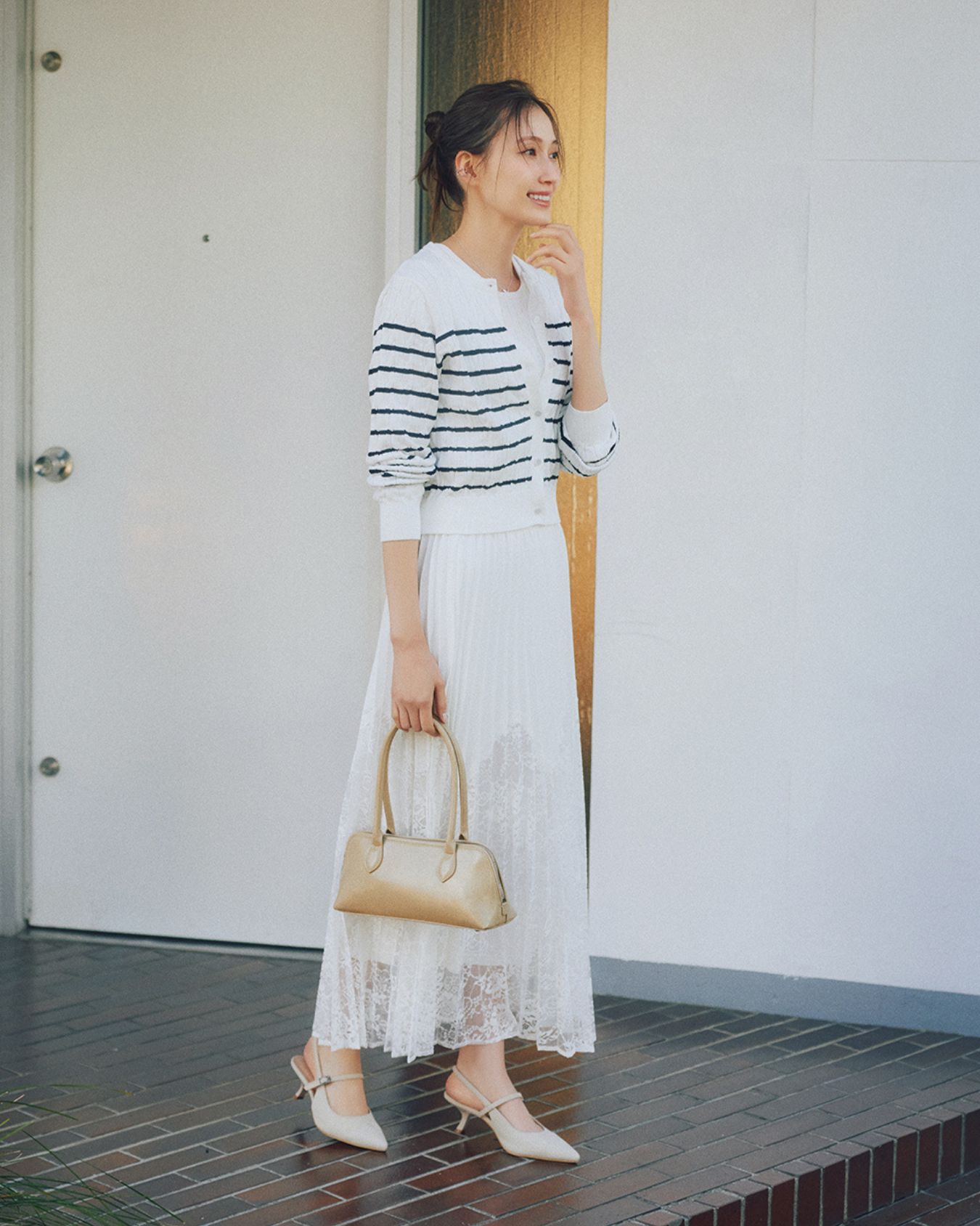 定番のボーダーカーディガンを、ドラマチックなレーススカートでアップデート。 甘さのあるレース素材も、クリーンなホワイトとピッチの整ったボーダーを合わせれば、洗練された大人のデイリースタイルに。 予定がある日の通勤コーデにもぴったり。