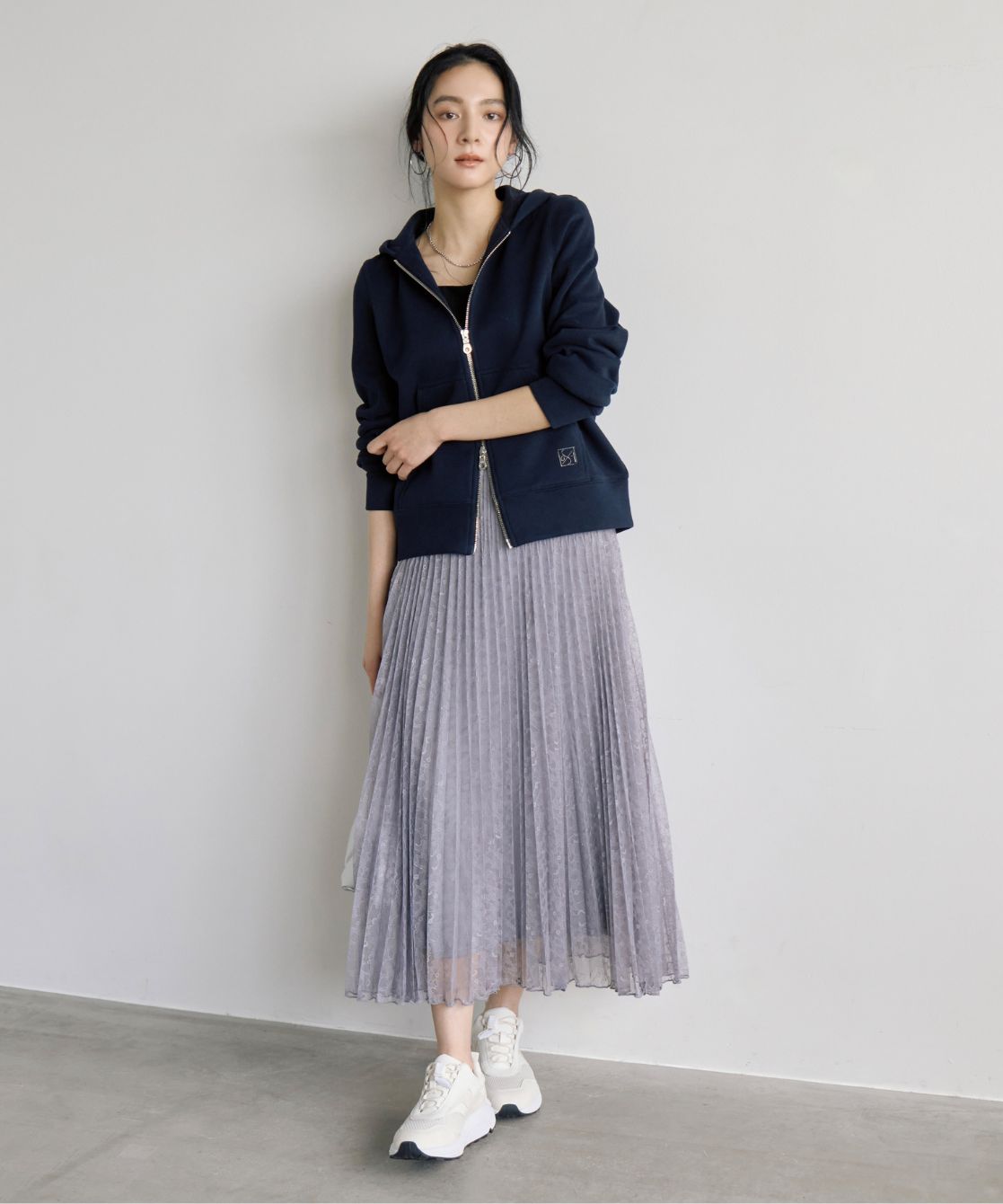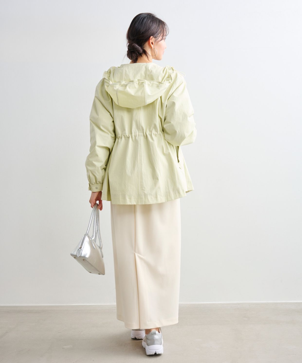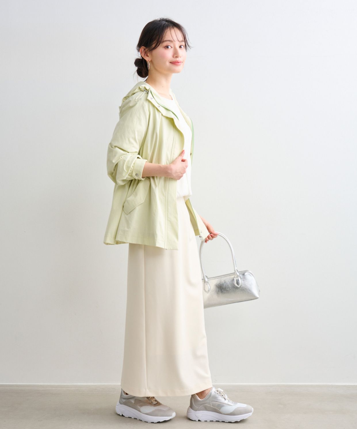 着用アイテム ウエストドロストフーディブルゾン ¥31,900 SIZE:38 ダイヤ柄透かし編みニットチュニック ¥18,700 SIZE:38 カットソータイトスカート ¥14,300 SIZE:38 デザインスニーカー ¥18,700 SIZE:M 横長ボストンバッグ ¥17,600 SIZE:00 ※着用商品以外はスタッフの私物になります