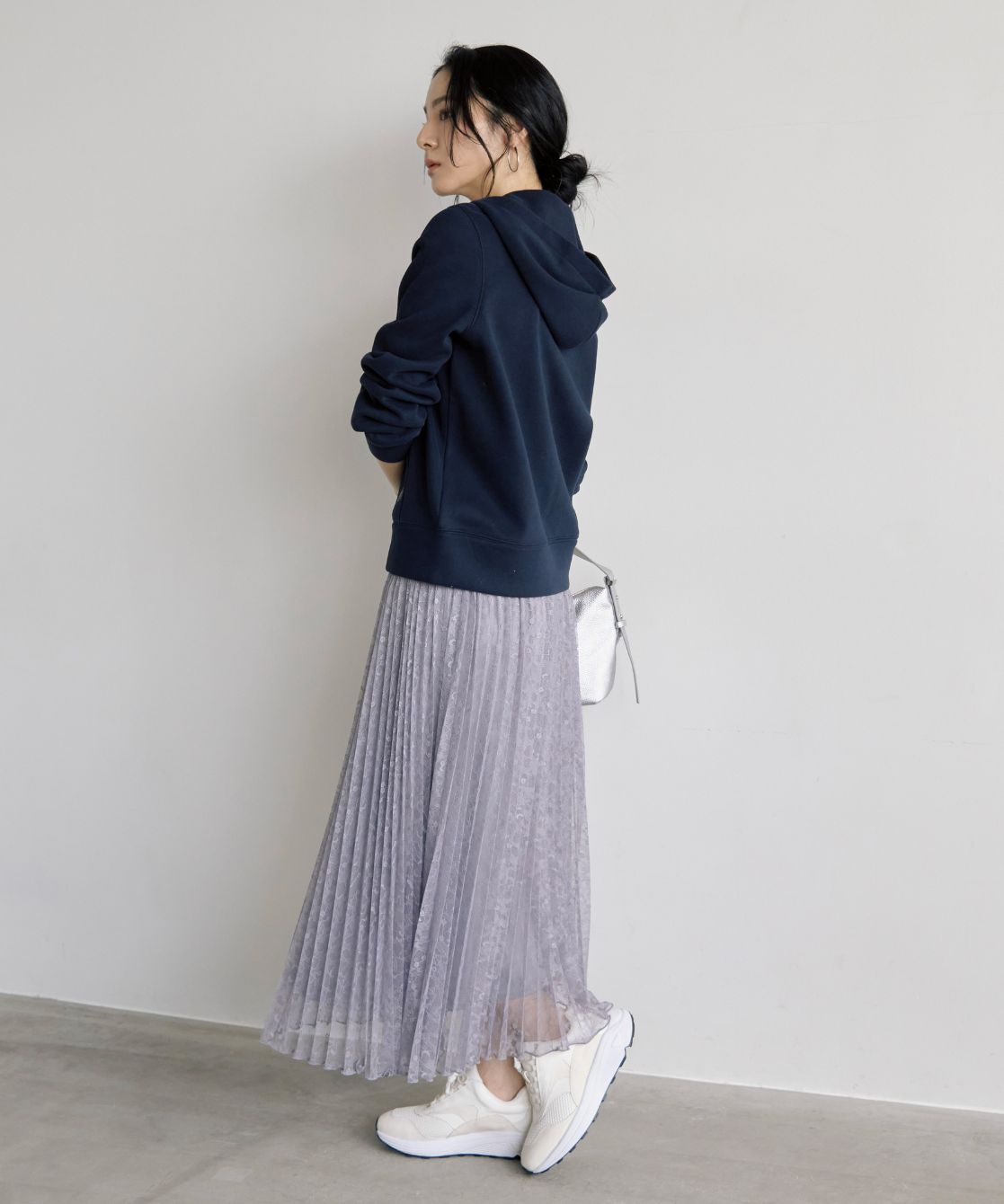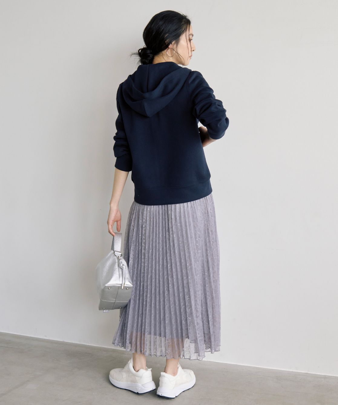 着用アイテム 裏起毛ZIPパーカー ¥17,600 SIZE:38 ラメ混レースプリーツスカート ¥24,200 SIZE:38 デザインスニーカー ¥18,700 SIZE:M ※着用商品以外はスタッフの私物になります