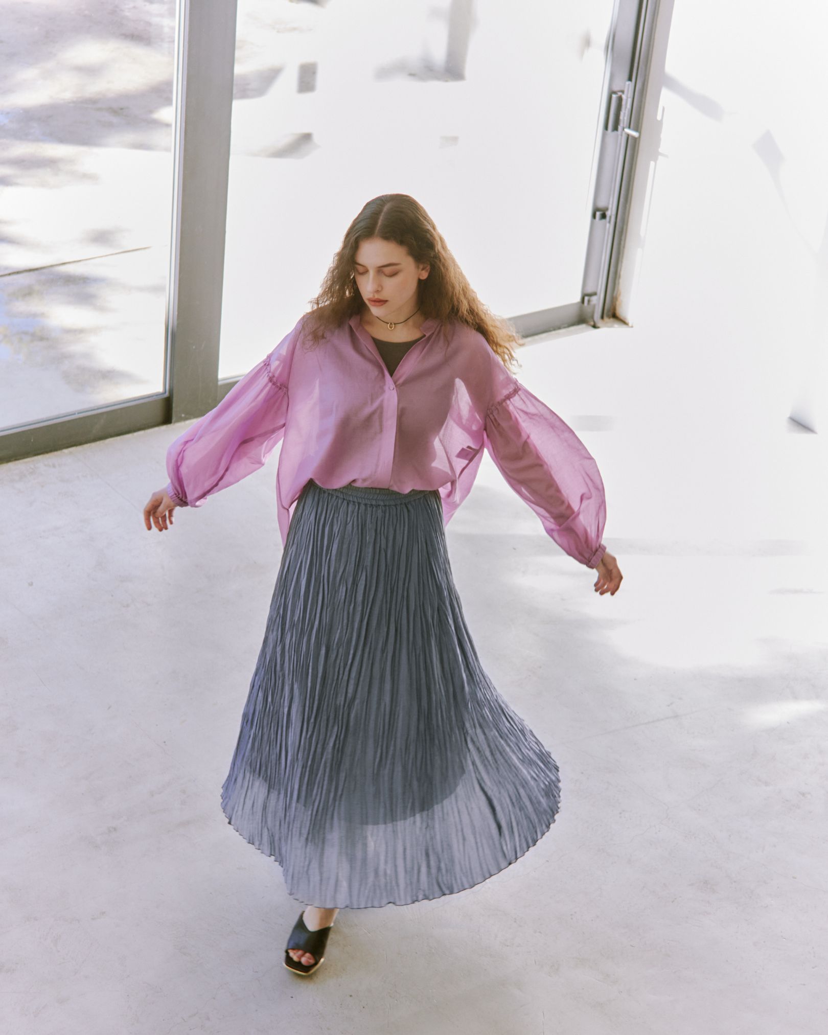 コットン×シルクで肌触りの心地良さもポイント。 歩くたびに軽やかに揺れるワッシャープリーツのスカートを合わせてリラクシーに。