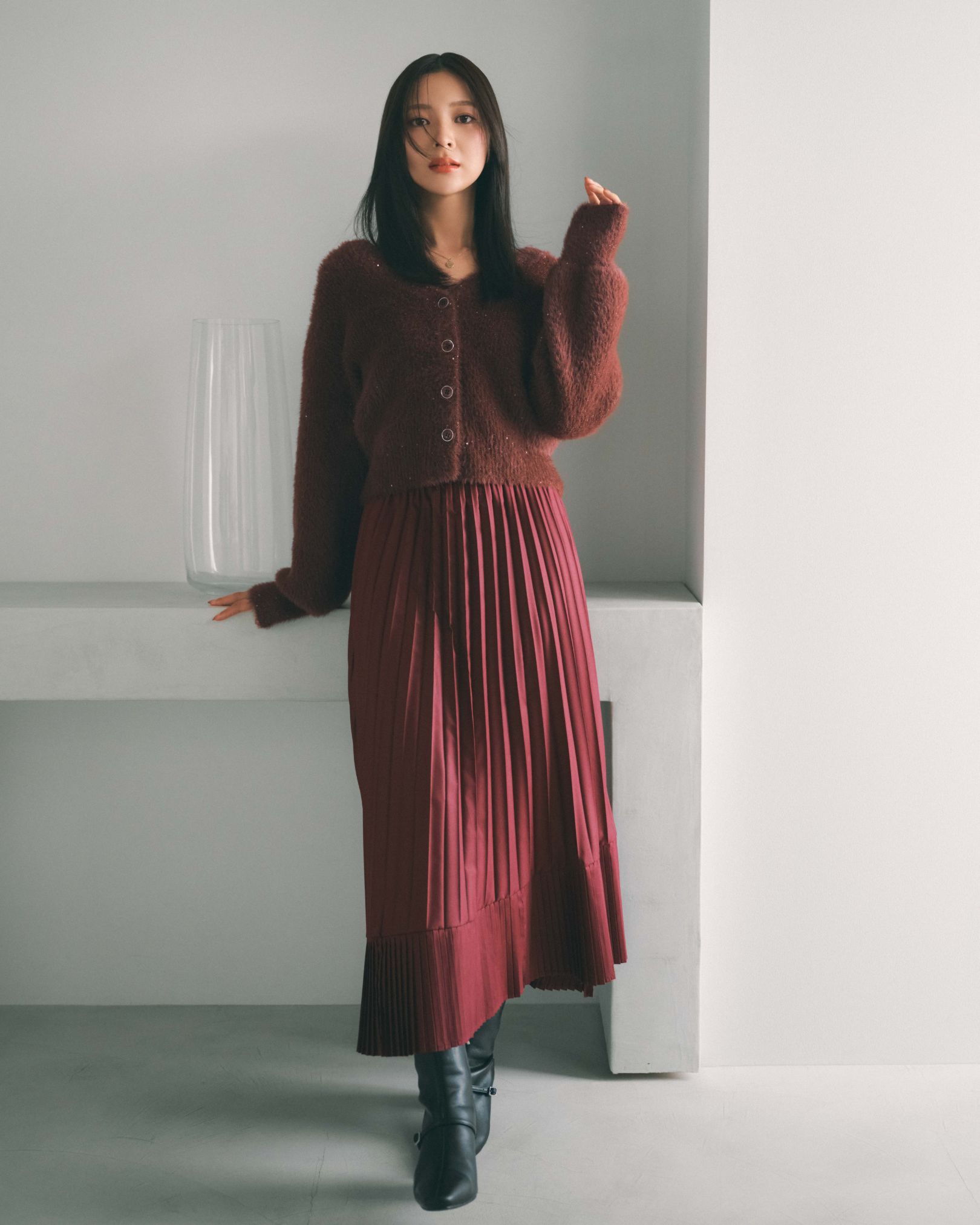 毛足長めのシャギーニットにスパンコールを散りばめたリッチな印象のカーディガン。