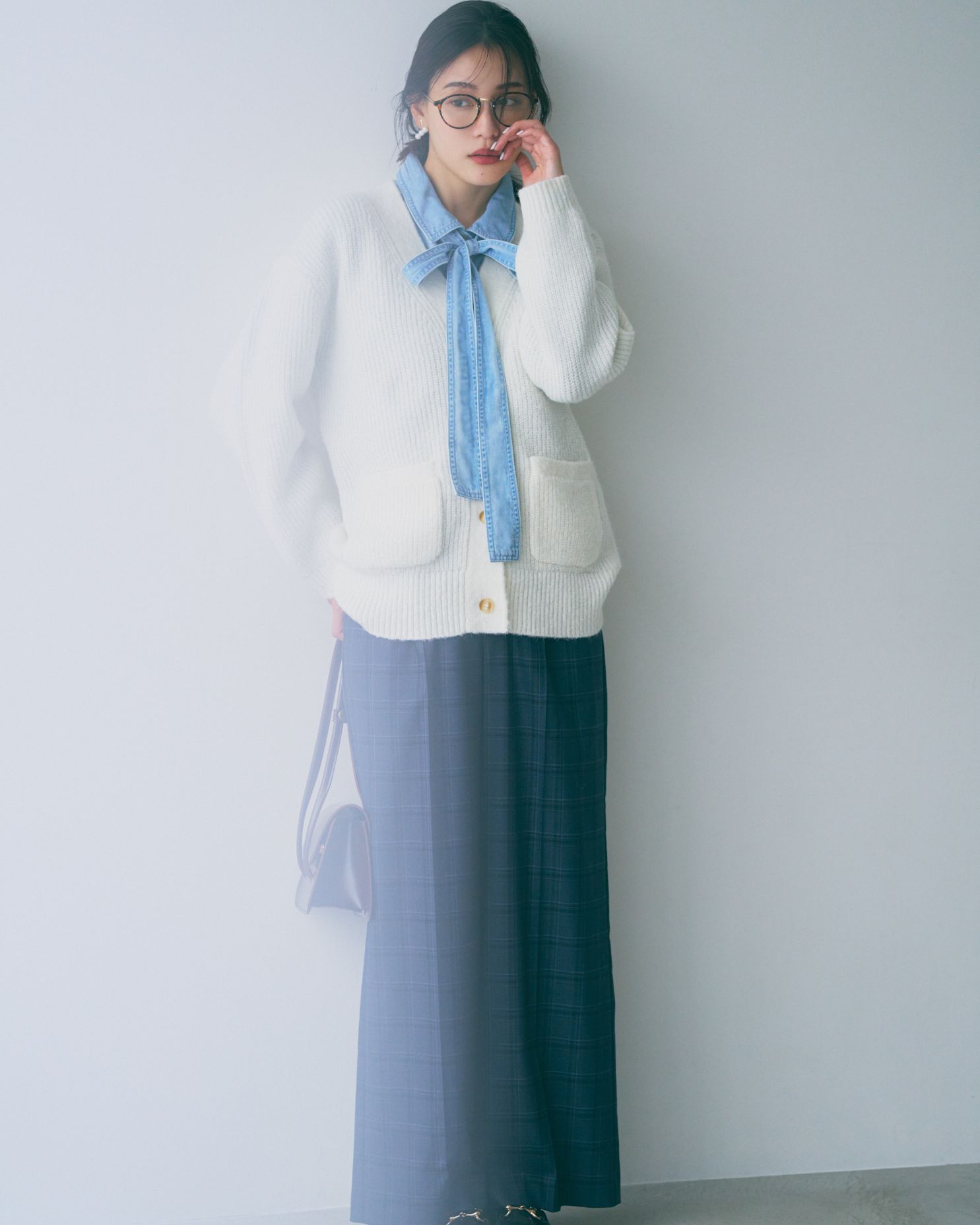 きらめくニットカーディガンはワントーンで冬の白を楽しんで