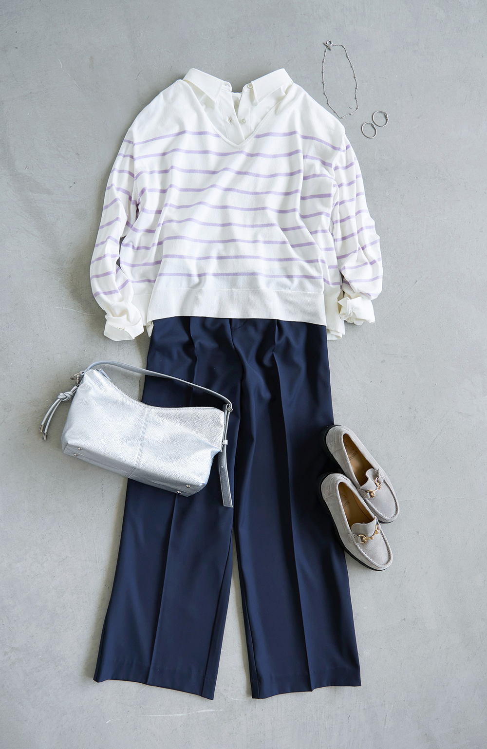 シルバーの小物合わせもポイントです。