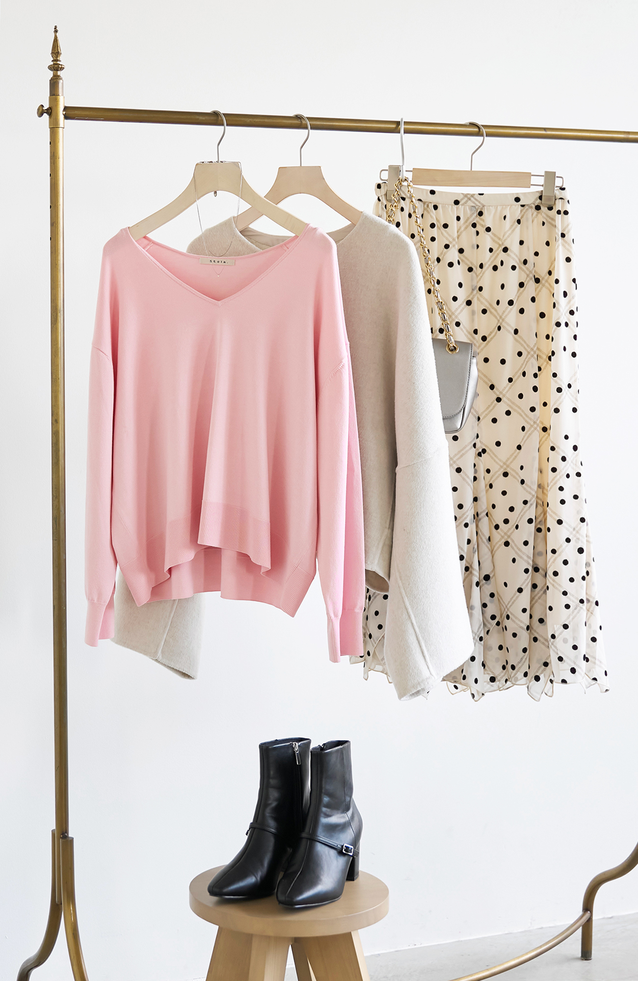ドットスカートと合わせて女性らしく。