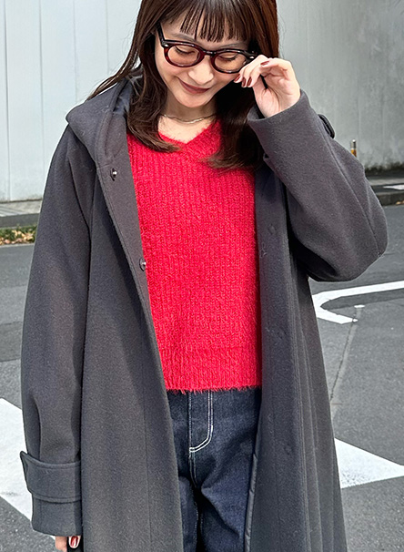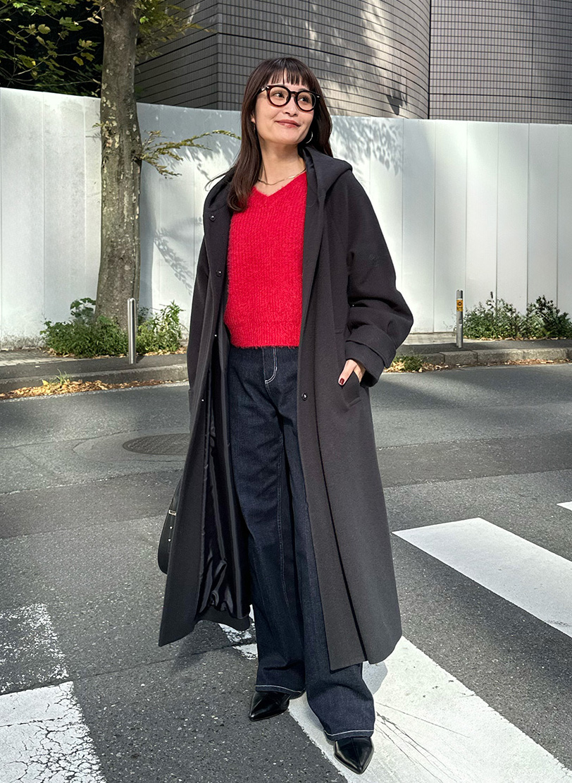 そんなときは、顔まわりに赤ニットを合わせて目線アップを。