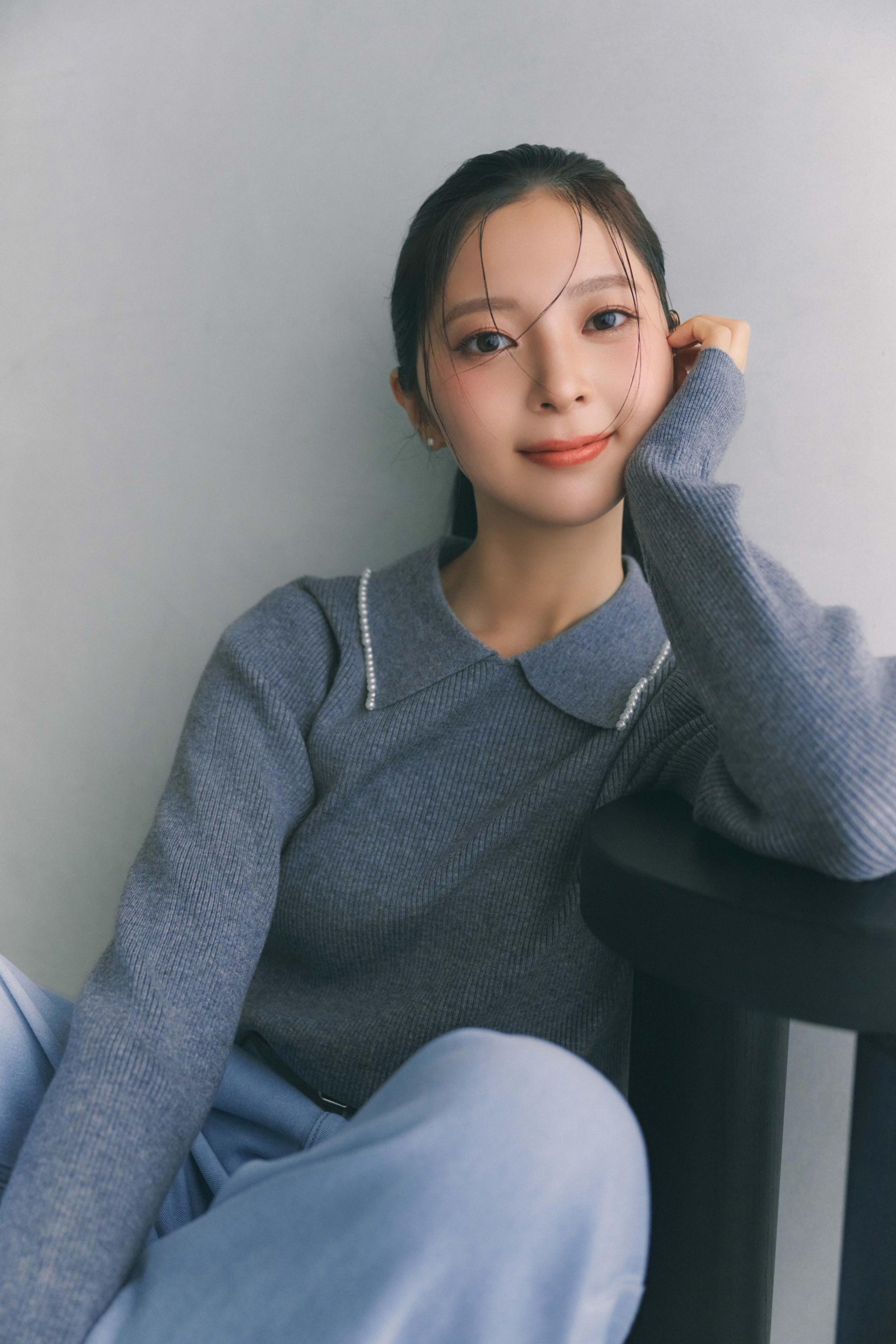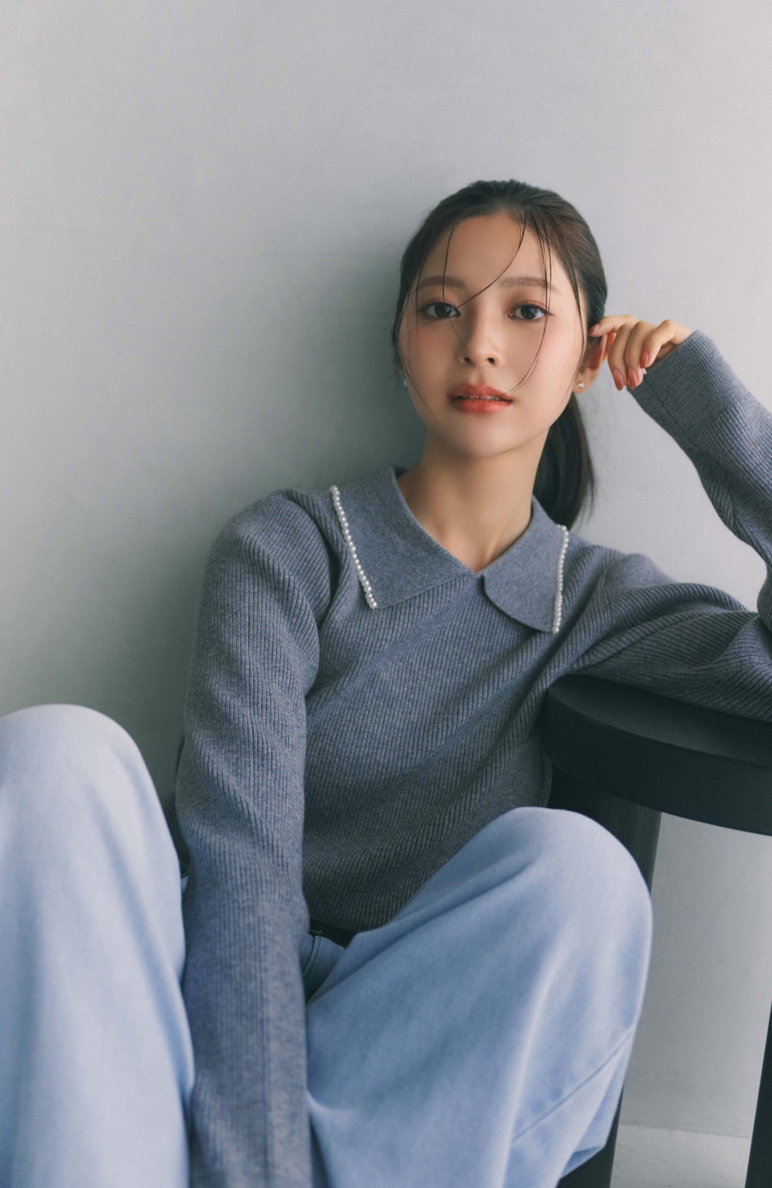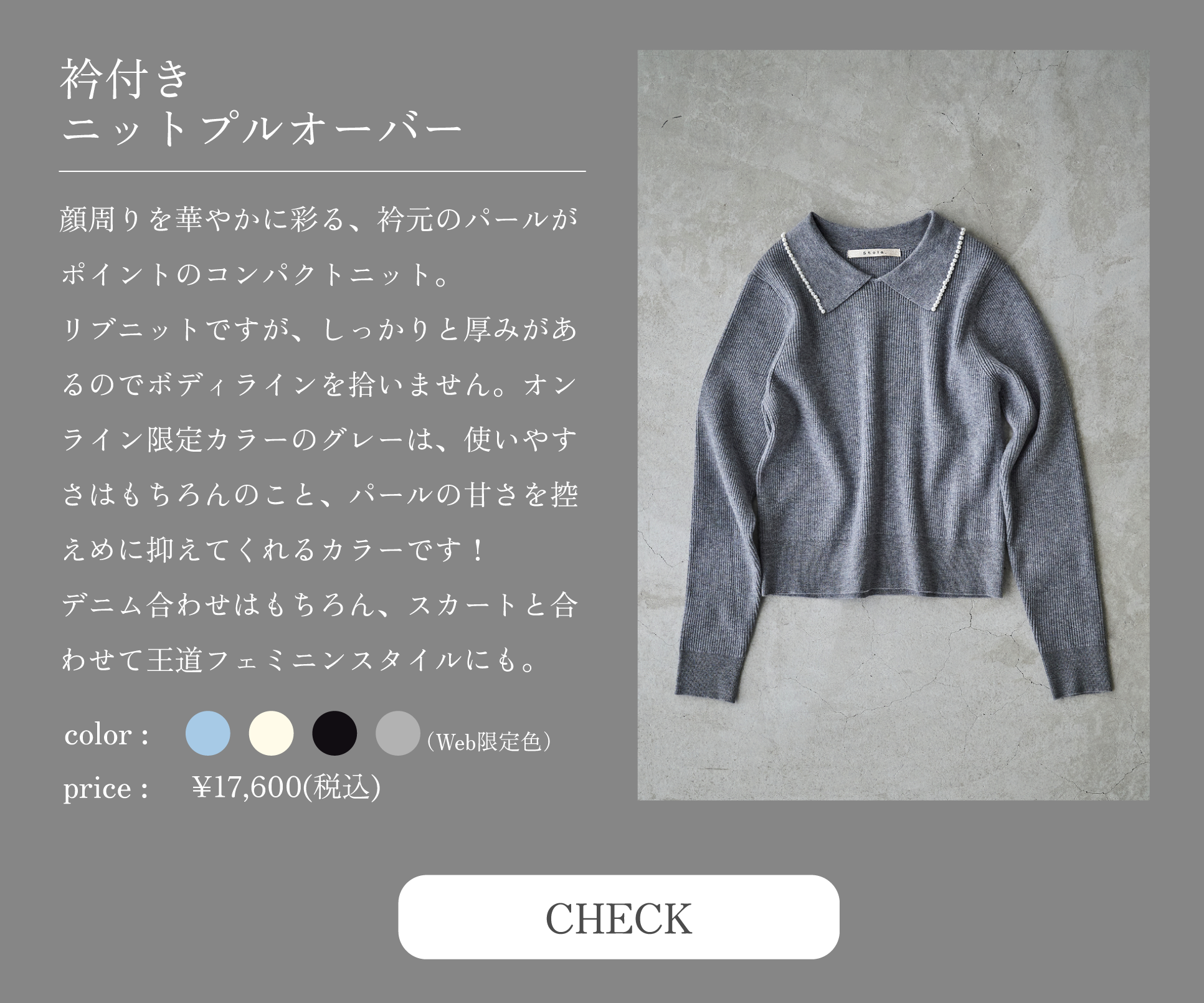 衿元のパールが目を引く、衿つきニットプルオーバーには