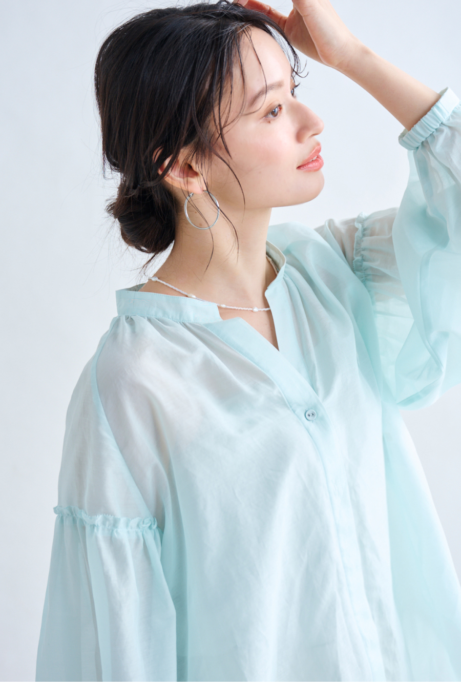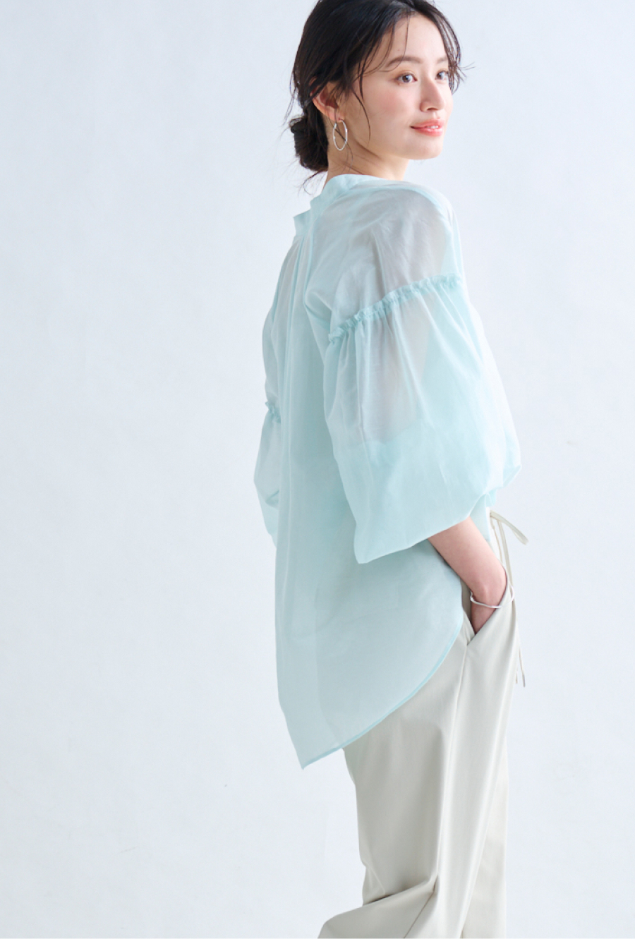 スタイリングに奥行きを与える、袖のギャザーと切り替えデザイン