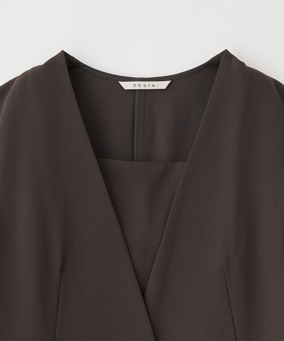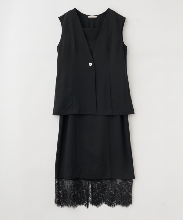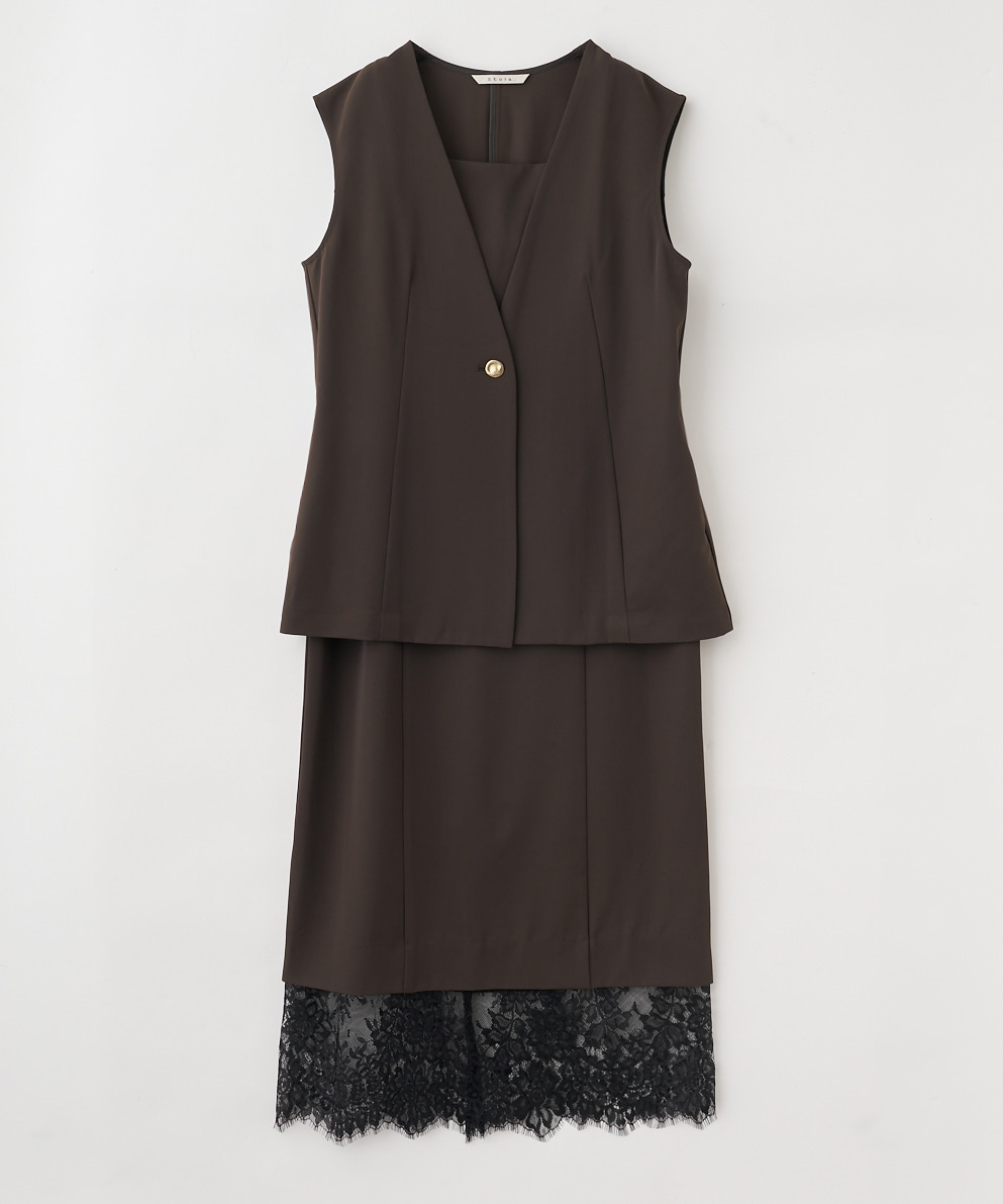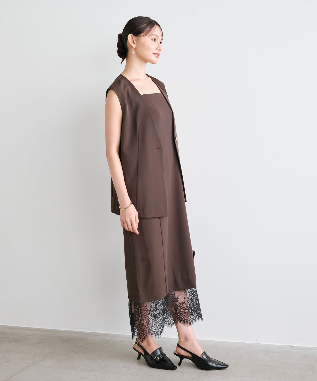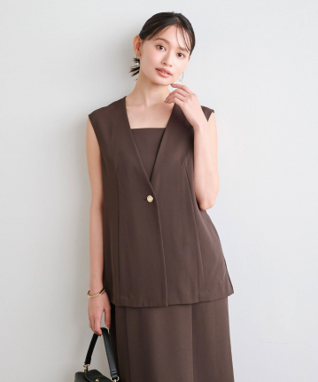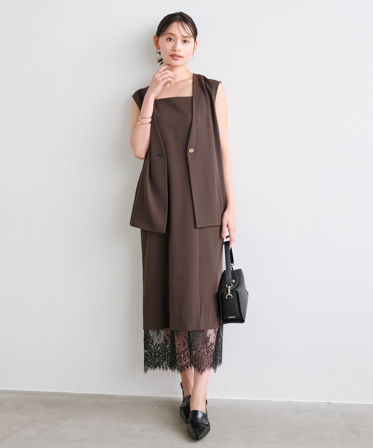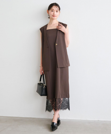 【サイズ感】:普段36着用でちょうど良い。ワンピースは細めのシルエットだが薄手のインナーなどをレイヤードできる程度の余裕がある。ジレはゆったりめのシルエット。