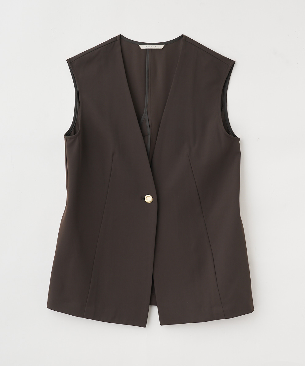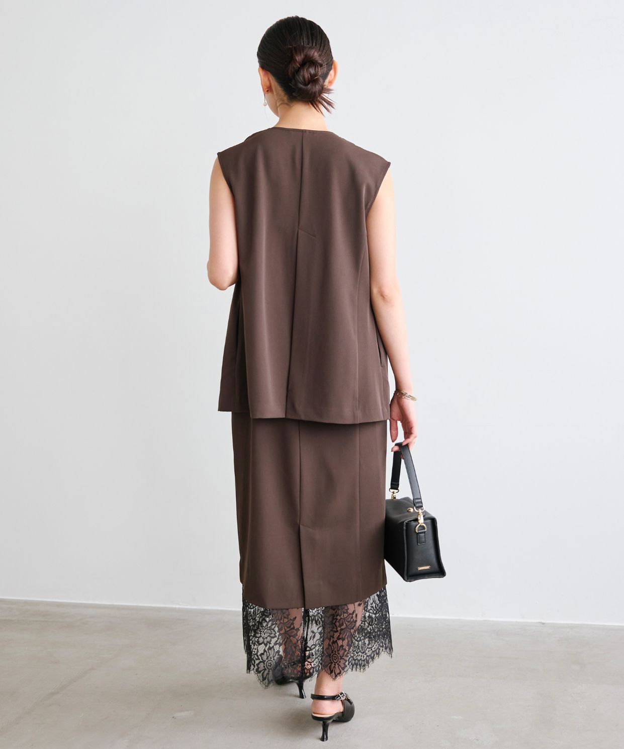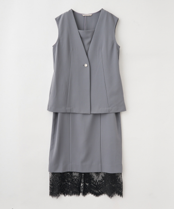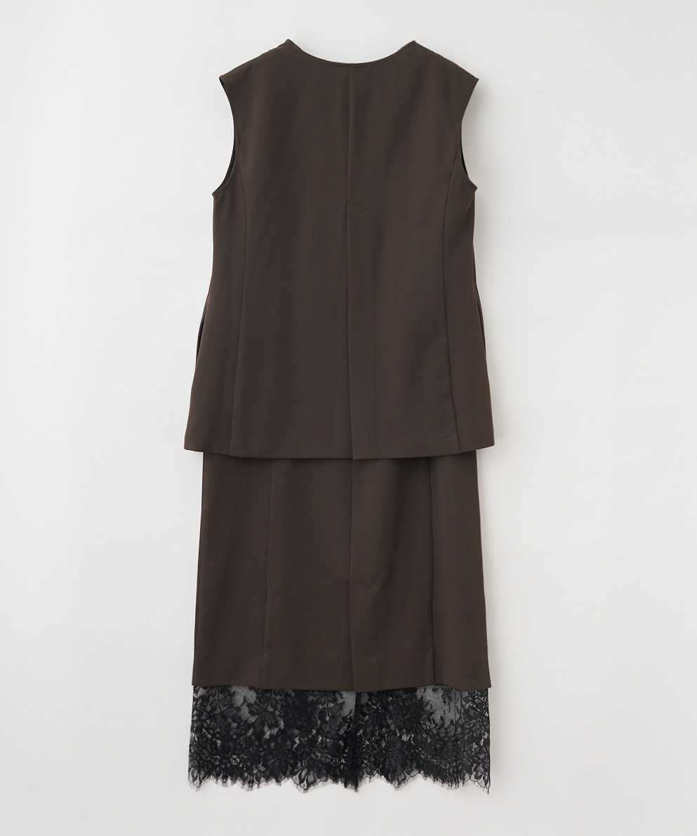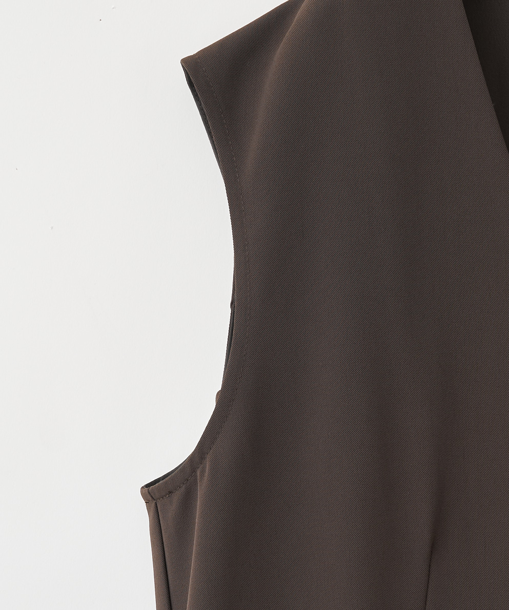 【サイズ感】:普段36着用でちょうど良い。ワンピースは細めのシルエットだが薄手のインナーなどをレイヤードできる程度の余裕がある。ジレはゆったりめのシルエット。