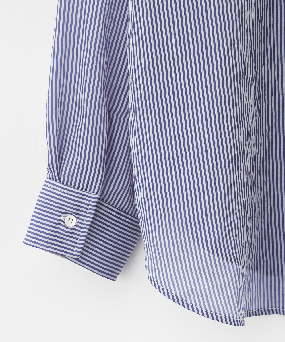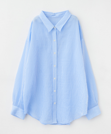 【着用感】:細幅のストライプなので、柄物が苦手な方でもお召しになりやすそうです。シアー素材ではありますが、素材に少し凹凸があるのとストライプ柄で透け感は控えめに感じます。