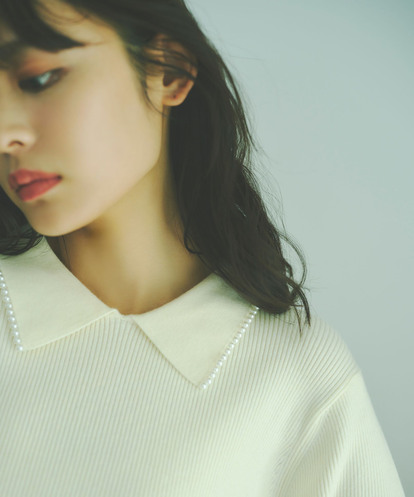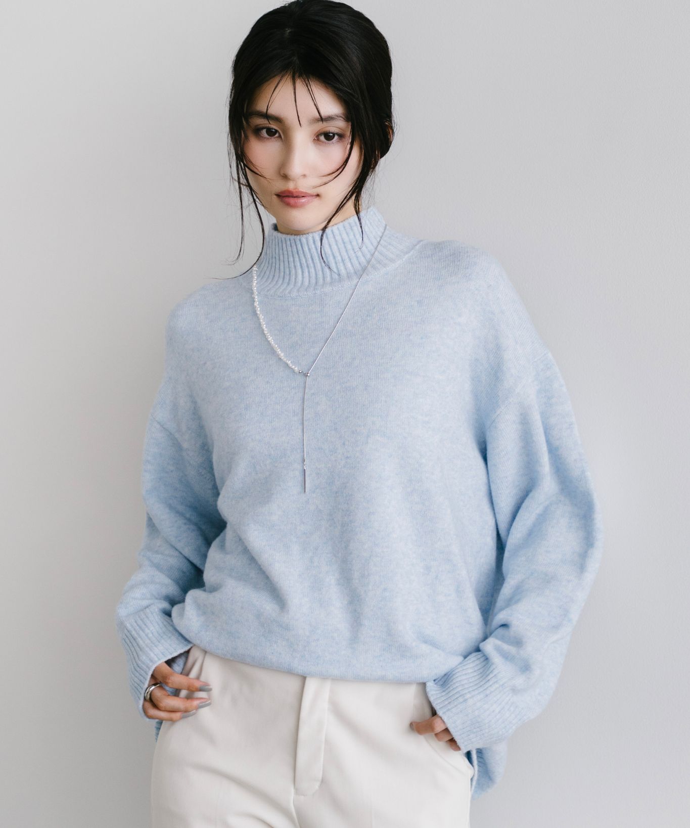 【着用感】:首に沿うようなボトルネックではなく、少し横に余裕があるので、首が細く見え、また締め付け感がなく楽に着られます。