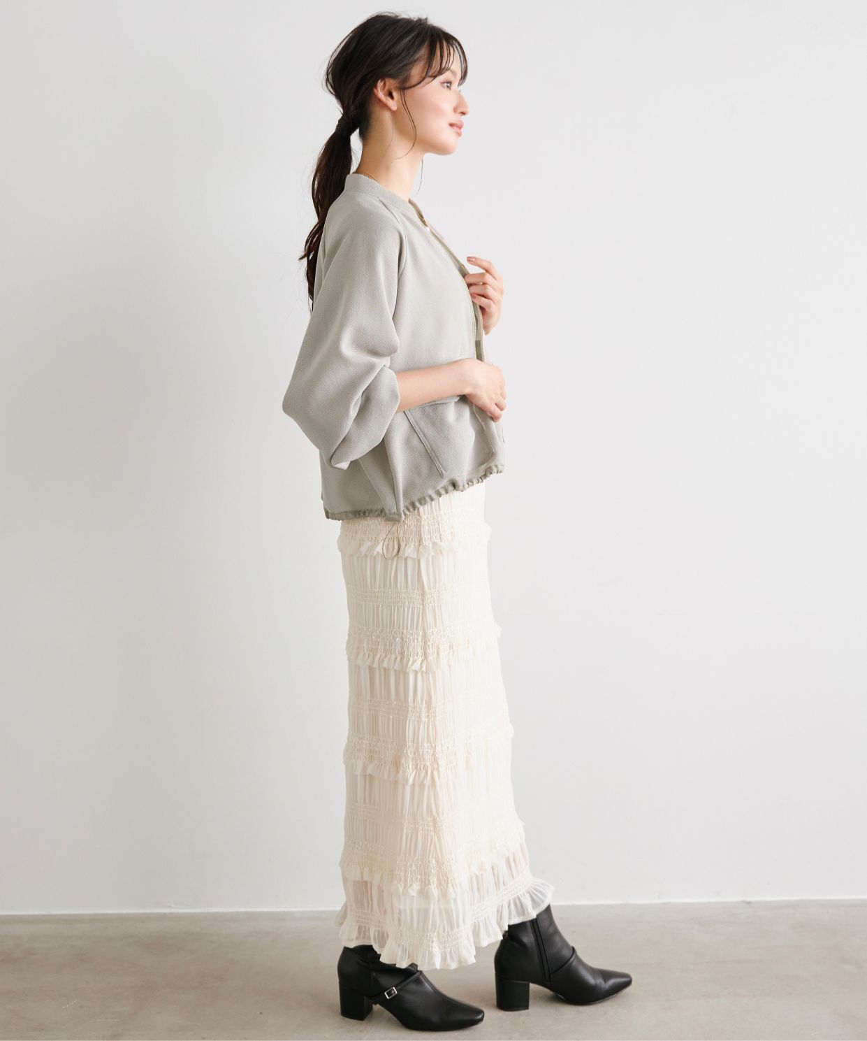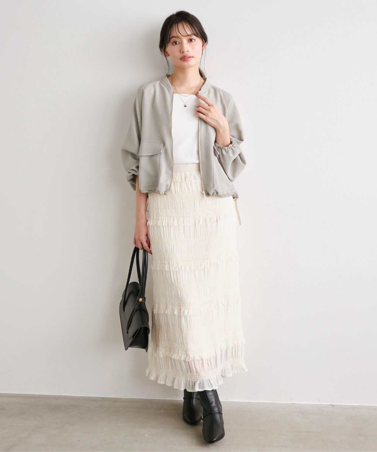 【おすすめスタイリング】:ワイドパンツやワンピースなど裾に広がりのあるアイテムに羽織ると、バランスが良くスッキリします -